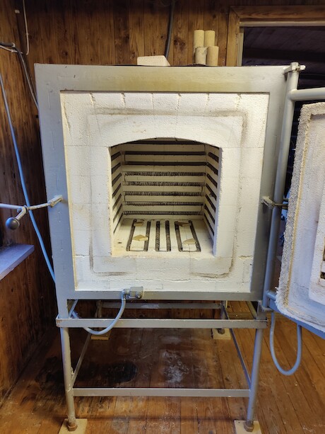 Stengodsugn, keramikugn, 3-fas, m. ställverk, tot mått: B = 90, Dj = 97, H = 164. Inkl. rullvagn.
