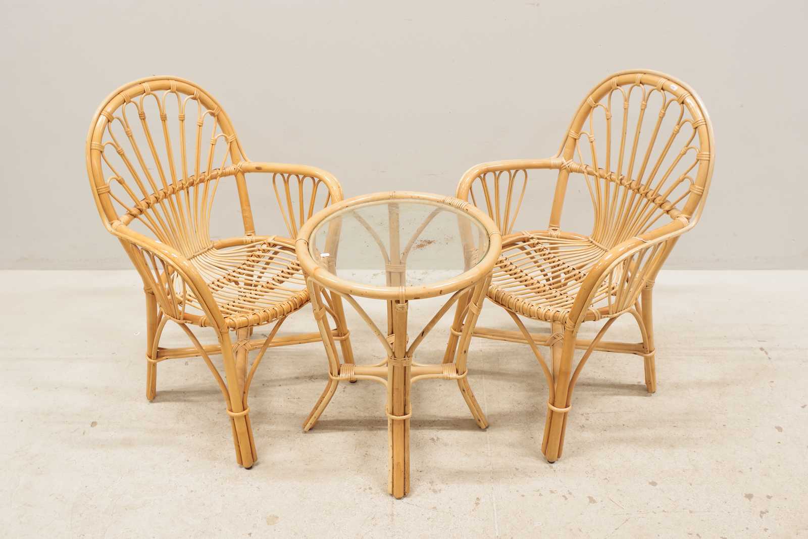 TRÄDGÅRDSMÖBEL, rotting, 2st karmstolar & bord, H: 64cm D: 50cm