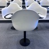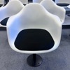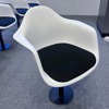 Skal i vit plast. Stativ i svart stål. Sits i svart tyg.