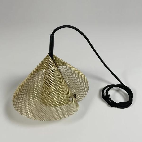 Begagnad taklampa från Bsweden. Modellen Diffus har skärm tillverkad i anodiserad sträckmetall i aluminium. Lampan är i guldfärg och har svart textilkabel. Nypris ca 4000:-
