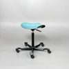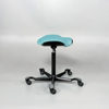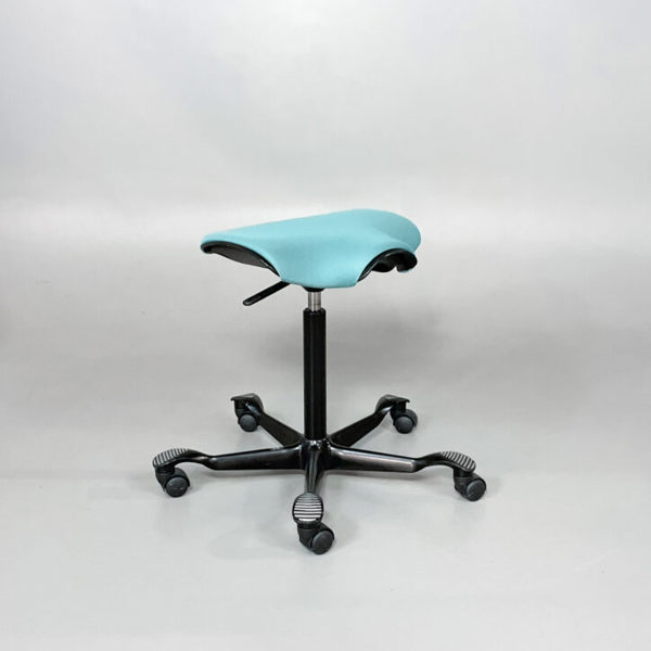 Arbetsstol från kända Håg, modell Capisco Puls 8002. En arbetsstol för aktivt sittande. Sitsen har en extra vadderad sittdyna för bättre komfort. Stomme i svart med dyna i turkost tyg.
