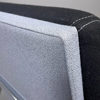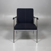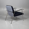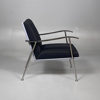 Fåtölj från Lammhults. Modell Sahara är en elegant och stilfull sittmöbel designad av Gunilla Allard. Fåtöljen är klädd i grått och svart tyg med grå sömmar. Den har kromade ben och armstöd i svartbets. Brukslitage. Nypris ca 11.000:-