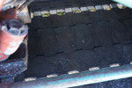 Det finns sprickor och tecken på slitage på mattan.