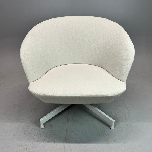 Fåtölj från Muuto, modell Oslo Lounge. Designad av Anderssen & Voll. Klädd i beige tyg, lackerad snurrstativ i beige/grå kulör.