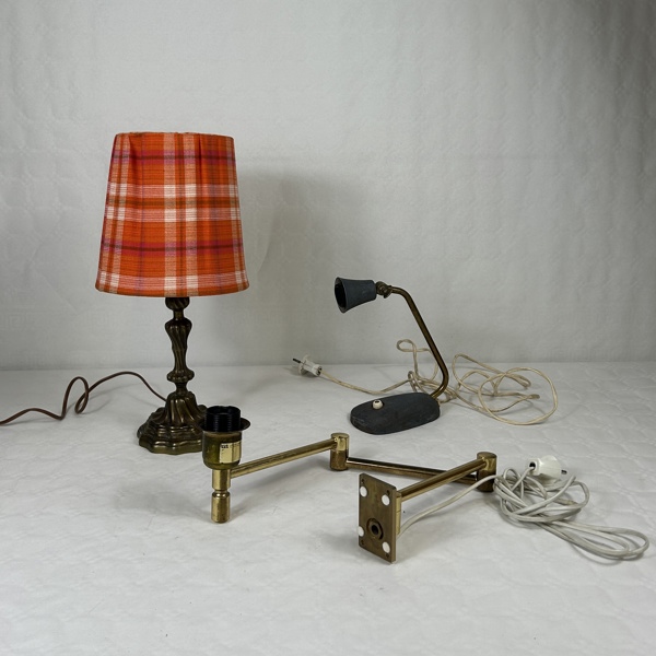 Bordslampa med skärm, höjd 42 cm. Vägglampa, längd 60 cm. Bordslampa, justerbar, höjd 23 cm.