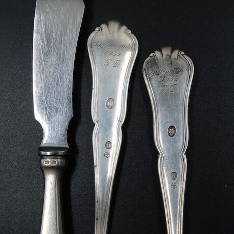 Auktioner Guld, Silver & Smycken Bestick 3 del, silver Danmark & Finland, äldre L=18 & mindre, knivblad i stål, tot vikt = 170g