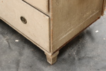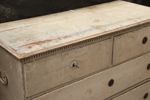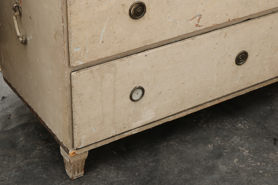 Gråmålad. Tvådelad. Med fem lådor. Tandad list. Etikettmärkt.
