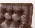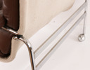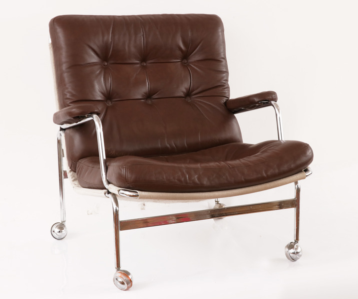 Kromad stål. Brun skinnklädsel med knappstoppning. Linnecanvas. På hjultrissor.