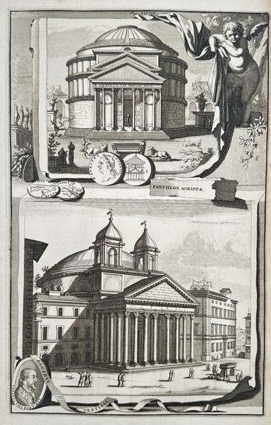 This engraving presents two views of the Pantheon in Rome. The upper panel, labeled "Pantheon Agrippae," shows a reconstruction of the original ancient structure as built by Marcus Agrippa, flanked by an allegorical figure and details of Roman coins. The larger lower panel, labeled "Vestigia," depicts the contemporary 18th-century appearance of the building, known as the church of Santa Maria ad Martyres or La Rotonda, with figures in the foreground piazza.
