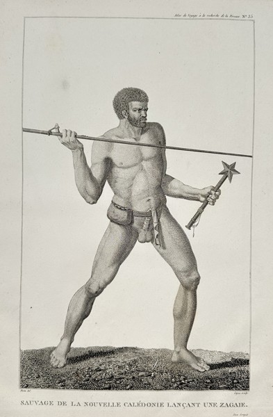 This ethnographic portrait of the Savage of New Caledonia throwing a Zagaie.This image originated from the French voyage of exploration led by Antoine Bruni d'Entrecasteaux (1791–1794), who searched for the lost expedition of La Pérouse. The illustration was drawn by the expedition's artist, Jean Piron, to document the people encountered in the Pacific.