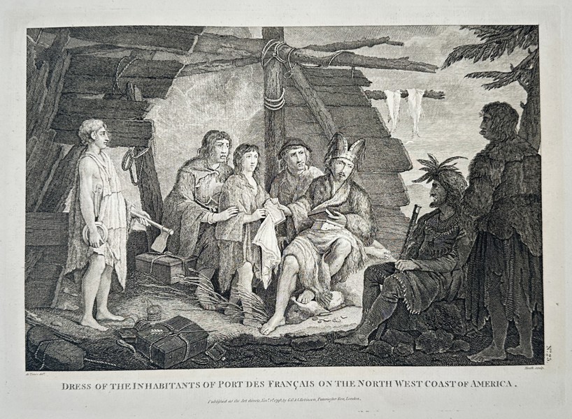 This ethnographic print is titled Dress of the Inhabitants of French Port on the North West Coast of America. The print was intended to document during the French voyage of exploration.