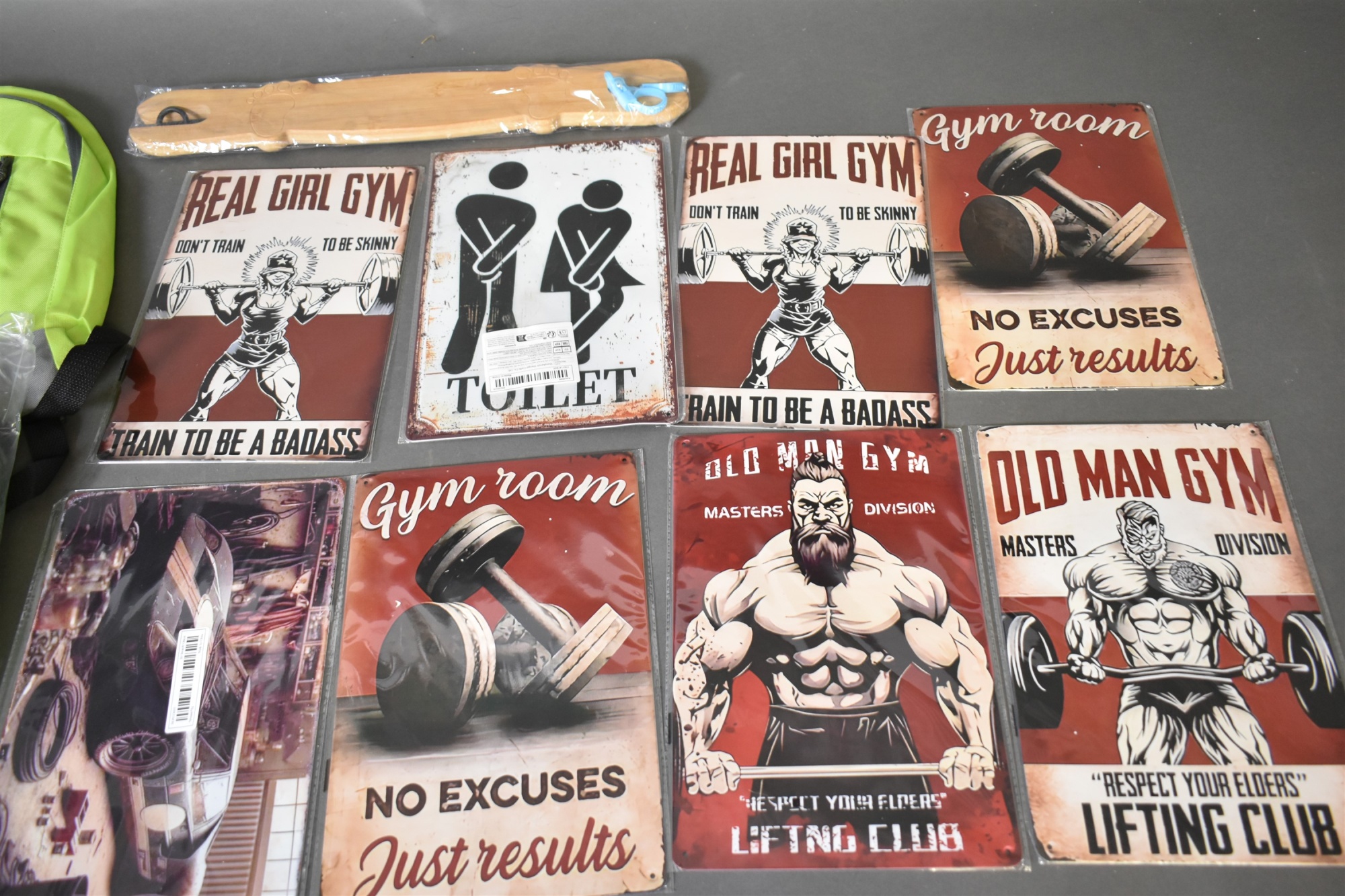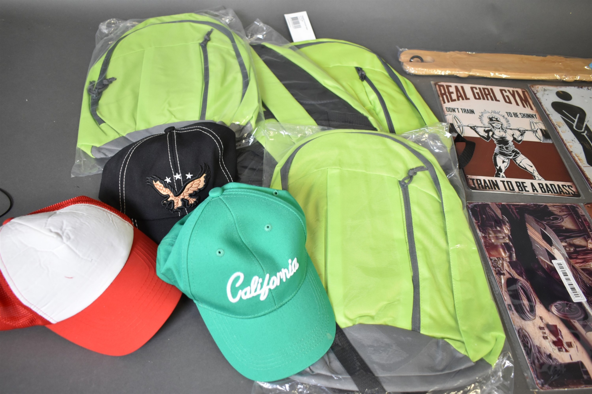 Parti plåtskyltar, ryggsäckar, kepsar, nytt längsta 50 cm