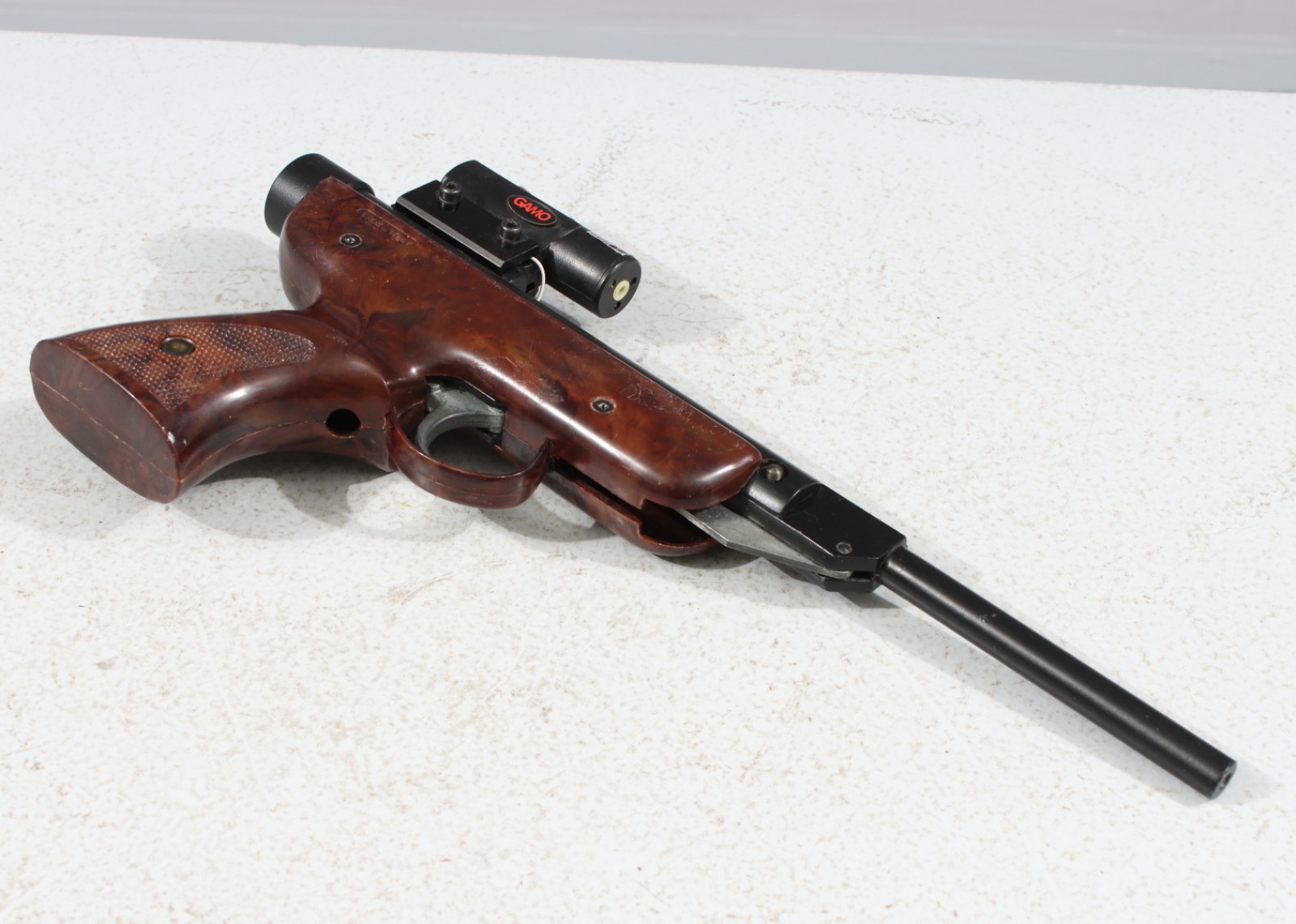 1900-talets andra hälft, cal:4,5 mm, fungerar vid test dock fungerar ej Gamo lasersikte då batteri och batterilucka saknas (ingen garanti lämnas), längd 35 cm. (vån3)