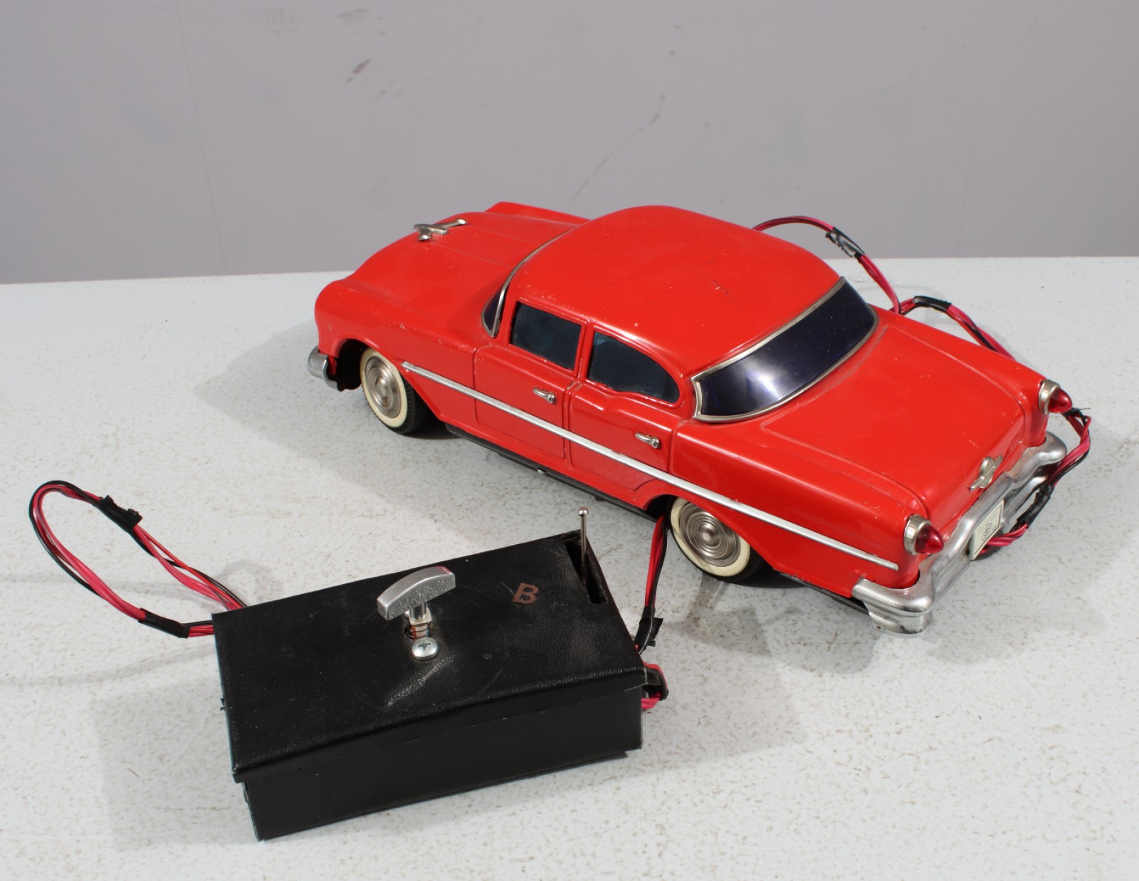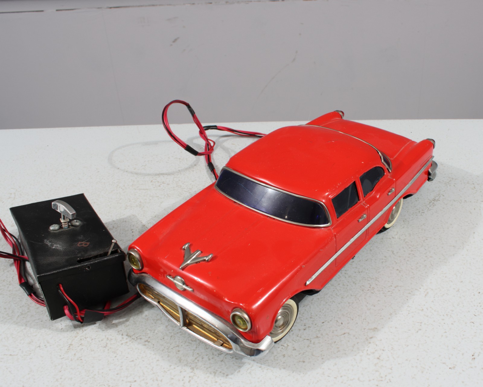 Plåt, 1950-tal, sladdstyrd, senare handkontroll, mindre åldersrelaterat slitage dock fungerar den ej vid test (ingen garanti lämnas), längd 35 cm. (vån3)