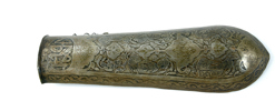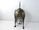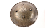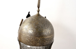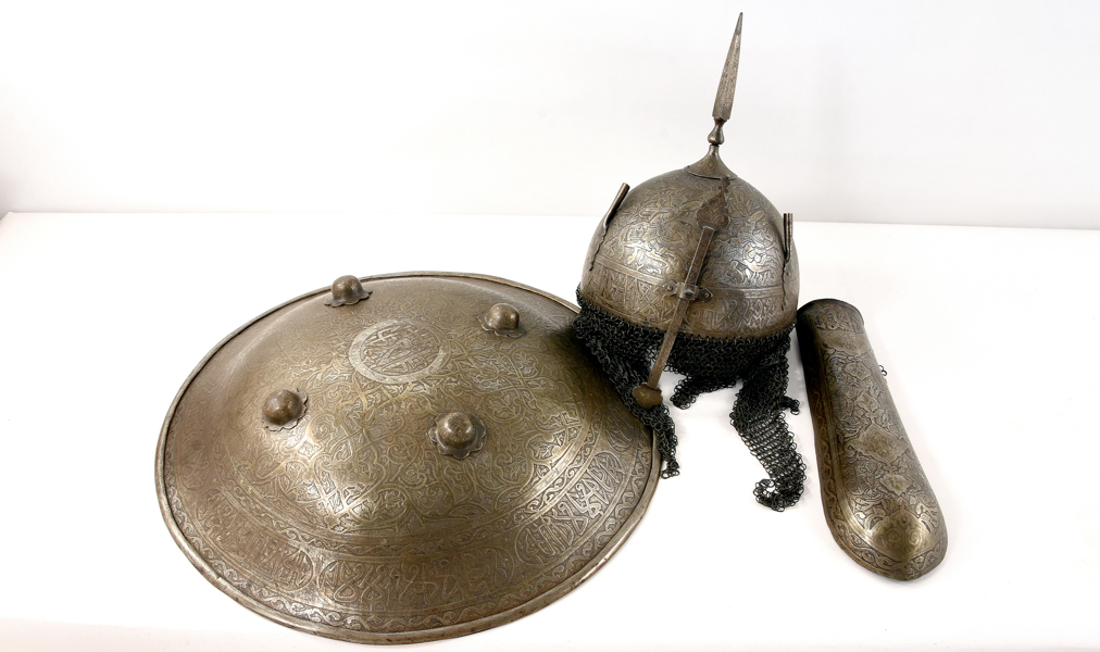Late 19th century, Helmet, Shield and Arm defence,Kulah- khud, Dhal, Bazu band, steel with etched decorations Shield 43,5 cm