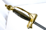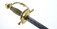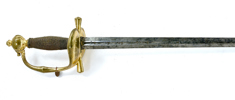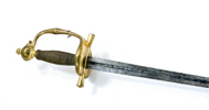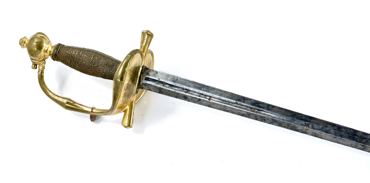 Svensk, ca 1780-90, förgyllt mässingsfäste, monterad med karolinsk klinga med C-monogram, 107,5 cm, klinga 91 cm; senare kavellindning