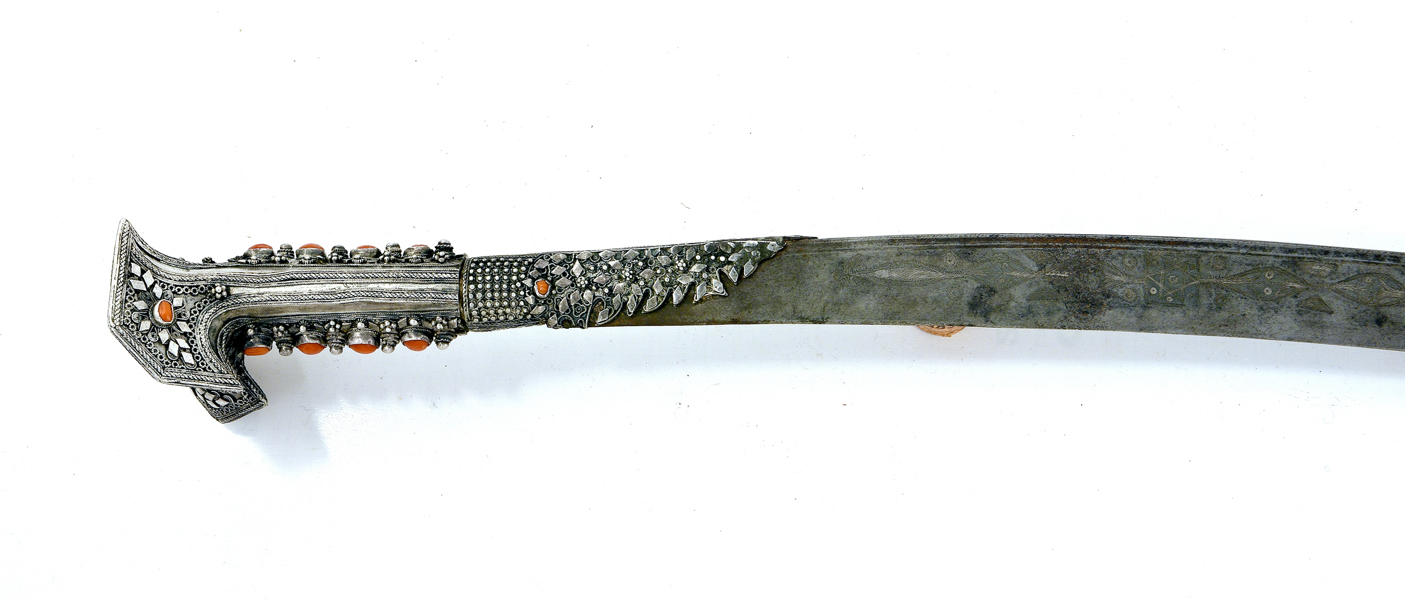 19th century, mounts in silver, blade with silver decorations and text, 68,5 cm