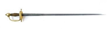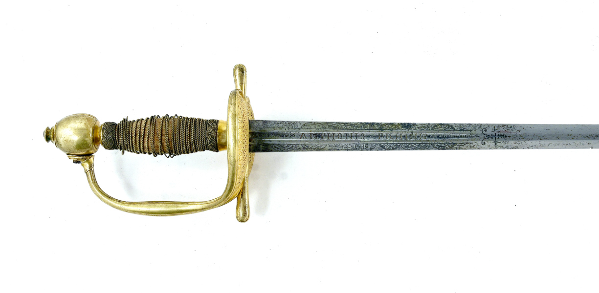 Svensk, tidigt 1700-tal, förgylld mässingsfäste med genombruten parerplåt, monterad med italiensk klinga märkt ANTHONIO PICHINIO, 95 cm, klinga 80 cm; lös lindning samt skruv senare