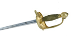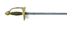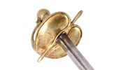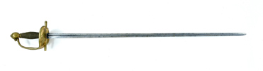 Mindre modell, tidigt 1700 tal, mässingsfäste med rest av förgyllning, klinga med blodrand, 95,5 cm, klinga 80 cm; senare kavellindning