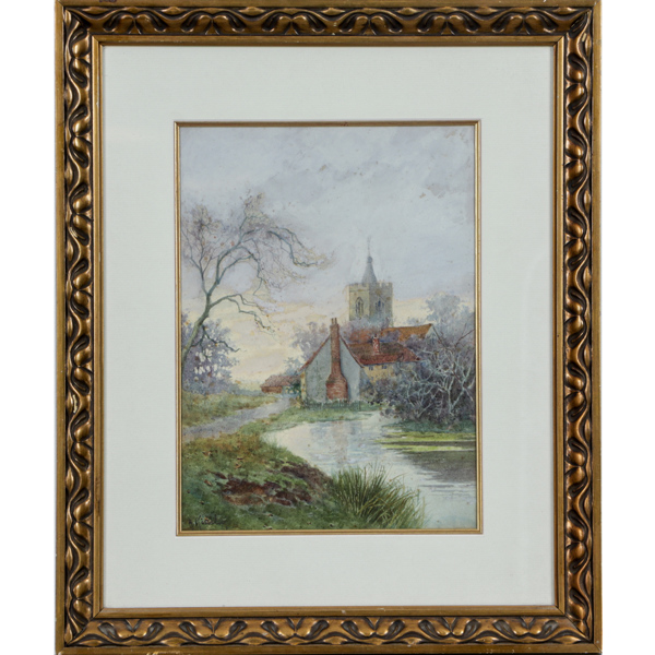 Bilder Albert Kinsley, (1852-1945), England, kyrka vid bäck, akvarell, signerad