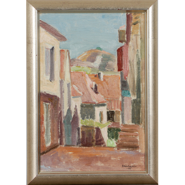 Bilder Ellis Wallin, "Bygatan", olja på duk, uppfodrad på pannå, signerad