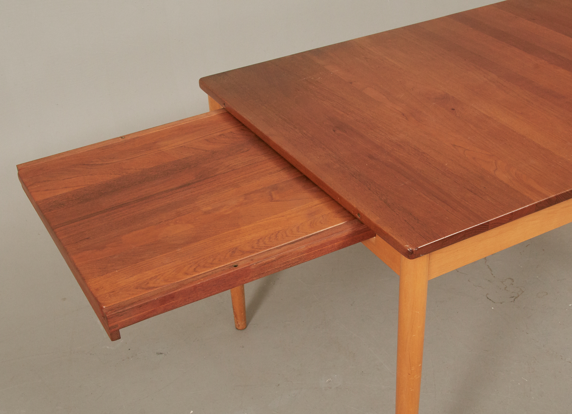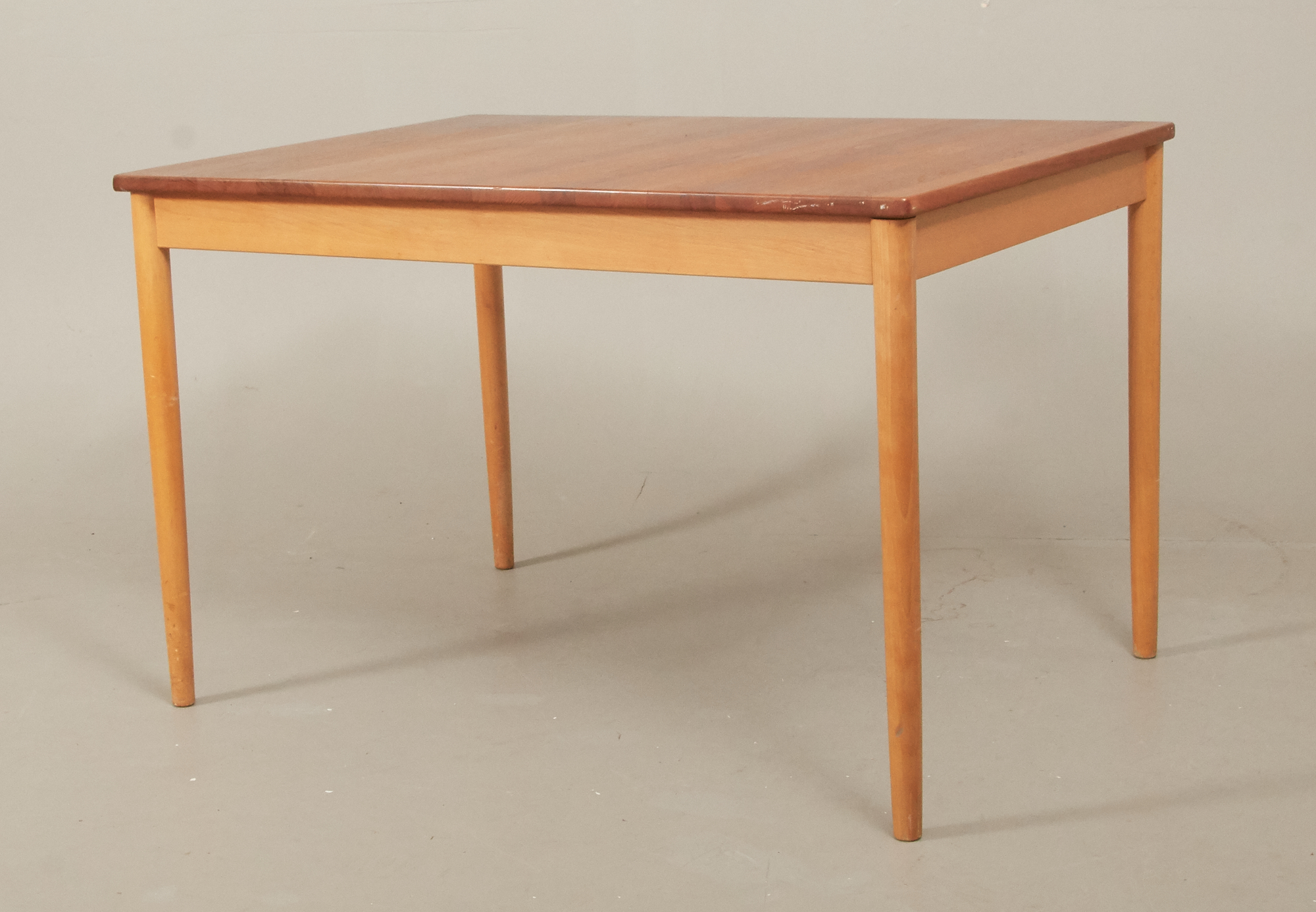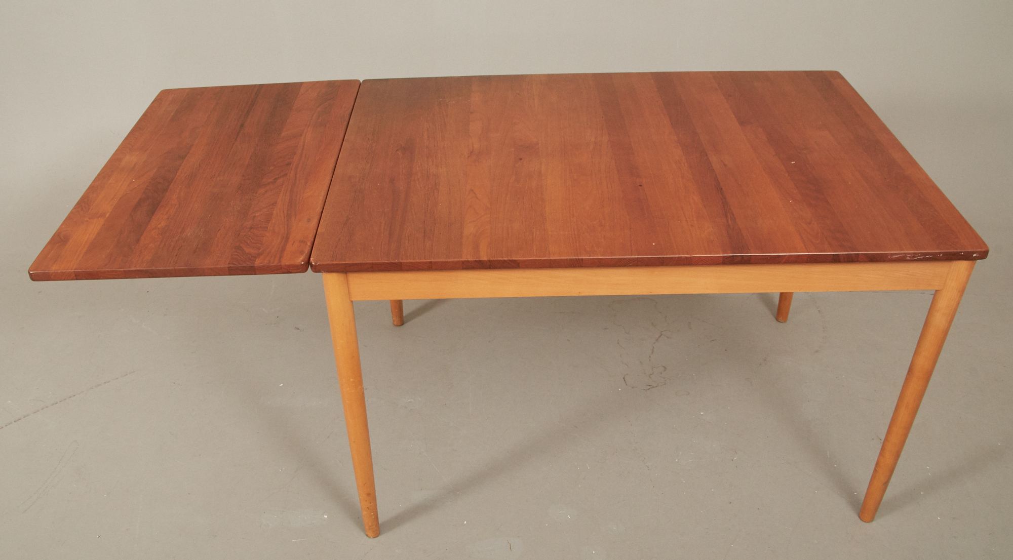 Teak, samt bok, 115 x 80 cm, höjd 73, en utdragsskiva 50 cm, bruksslitage.