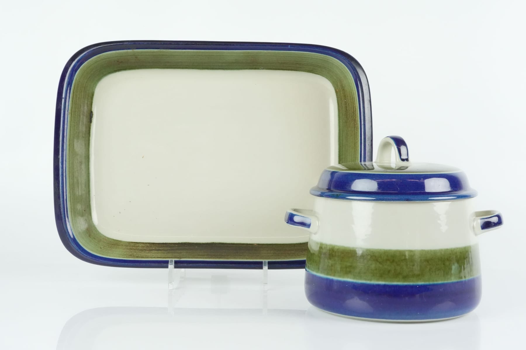 Dekor i underglasyrblått, diam. 38,5 cm, lagningar