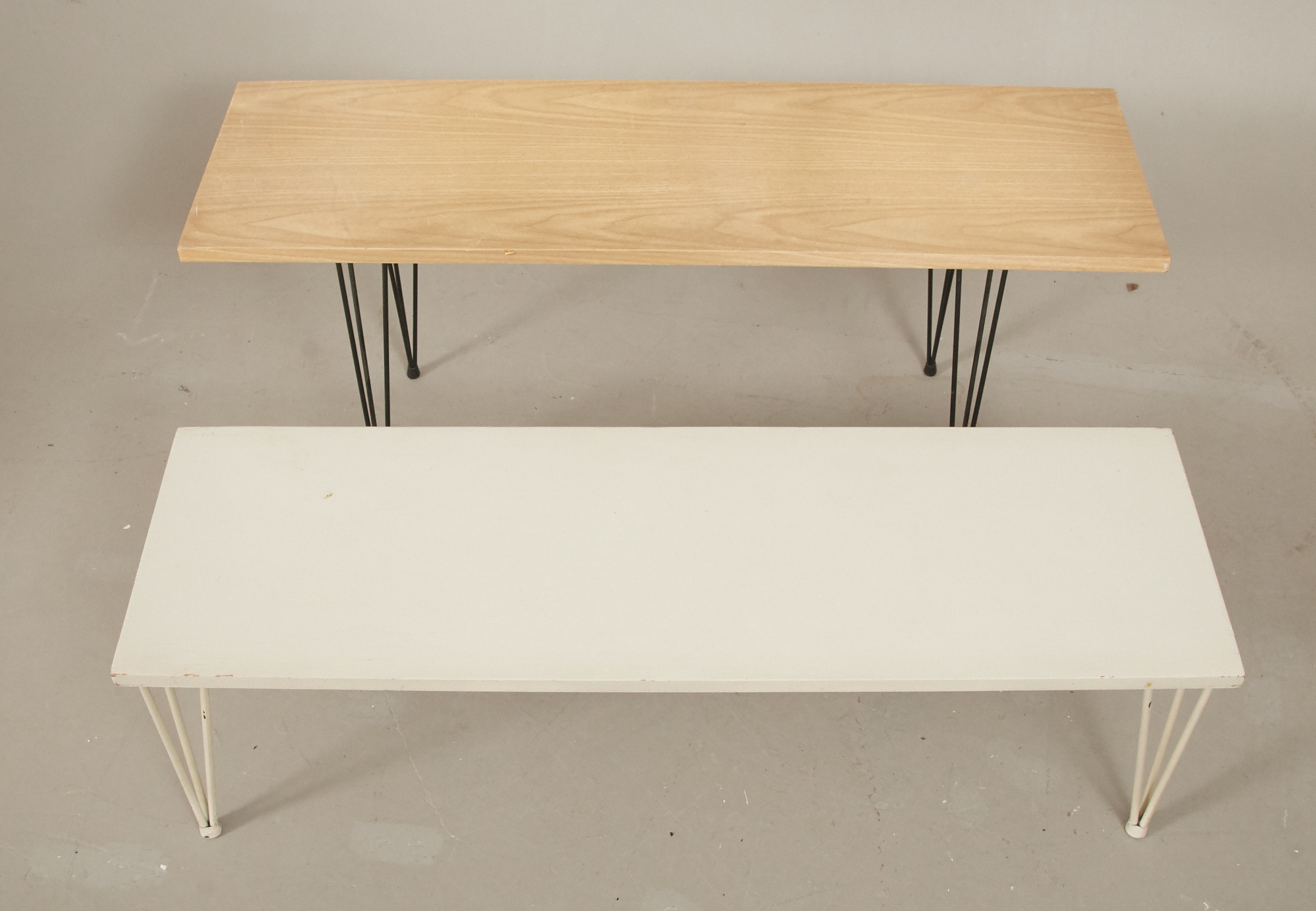 Två st, ett bemålat samt det andra klätt i trätapet . 100 x 30 cm, höjd 32-43 cm. Bruksslitage, färgskav, ett bord saknar skruvar till ben.