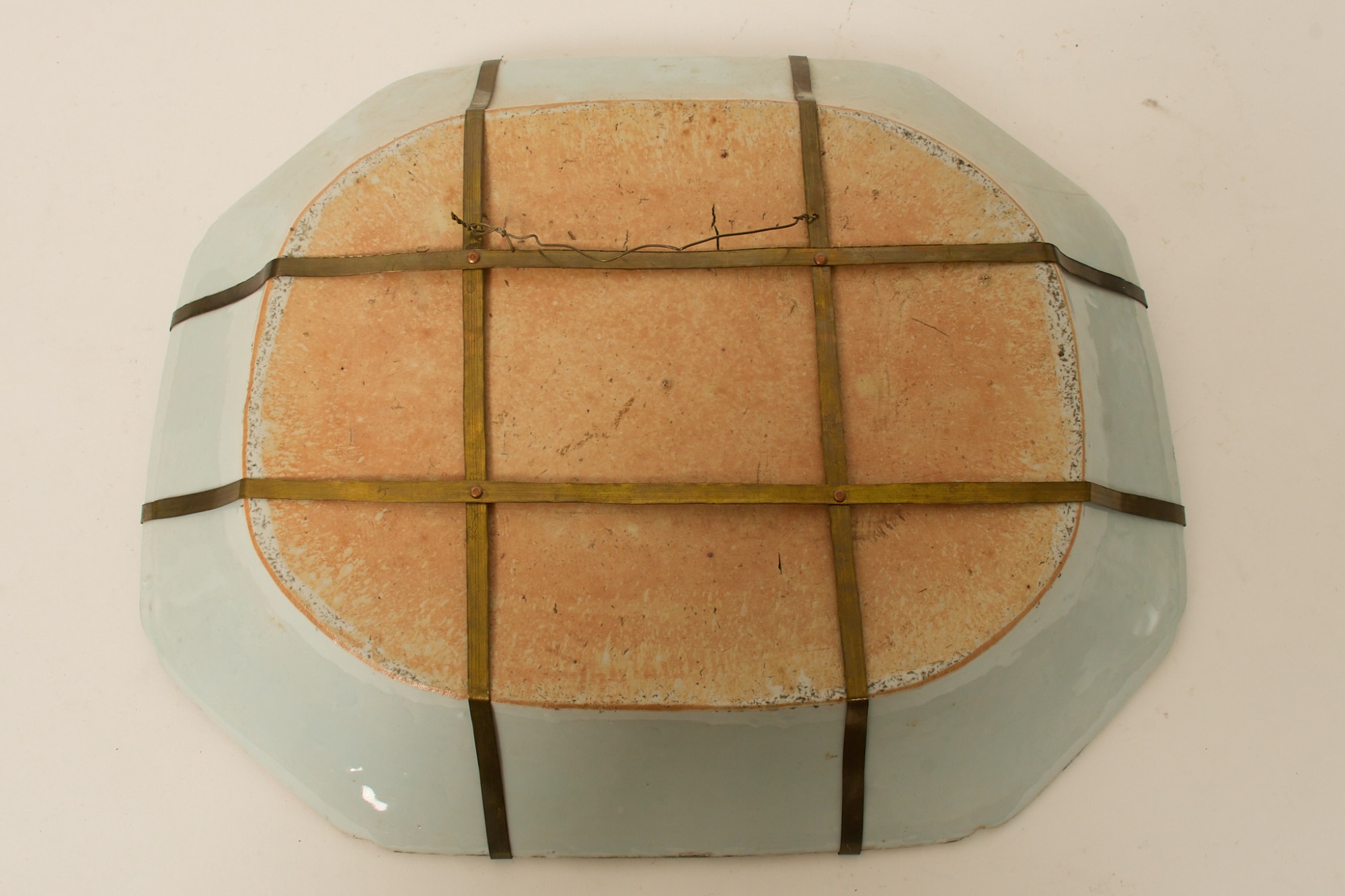 Dekor i underglasyrblått, samt dekor i Famille Rosefärger, figurscen, längd 42 cm, hårspricka, minimala kantnagg.