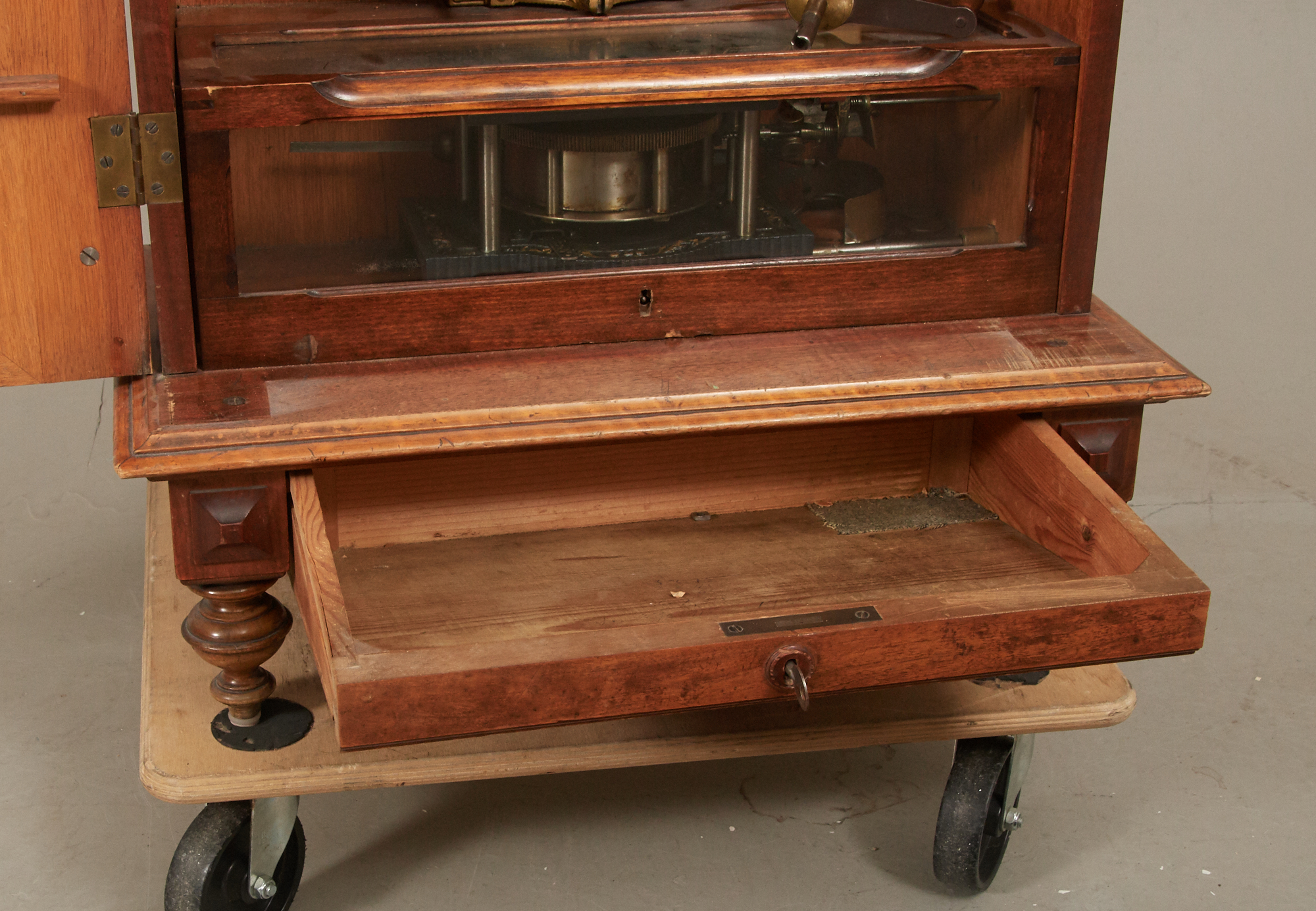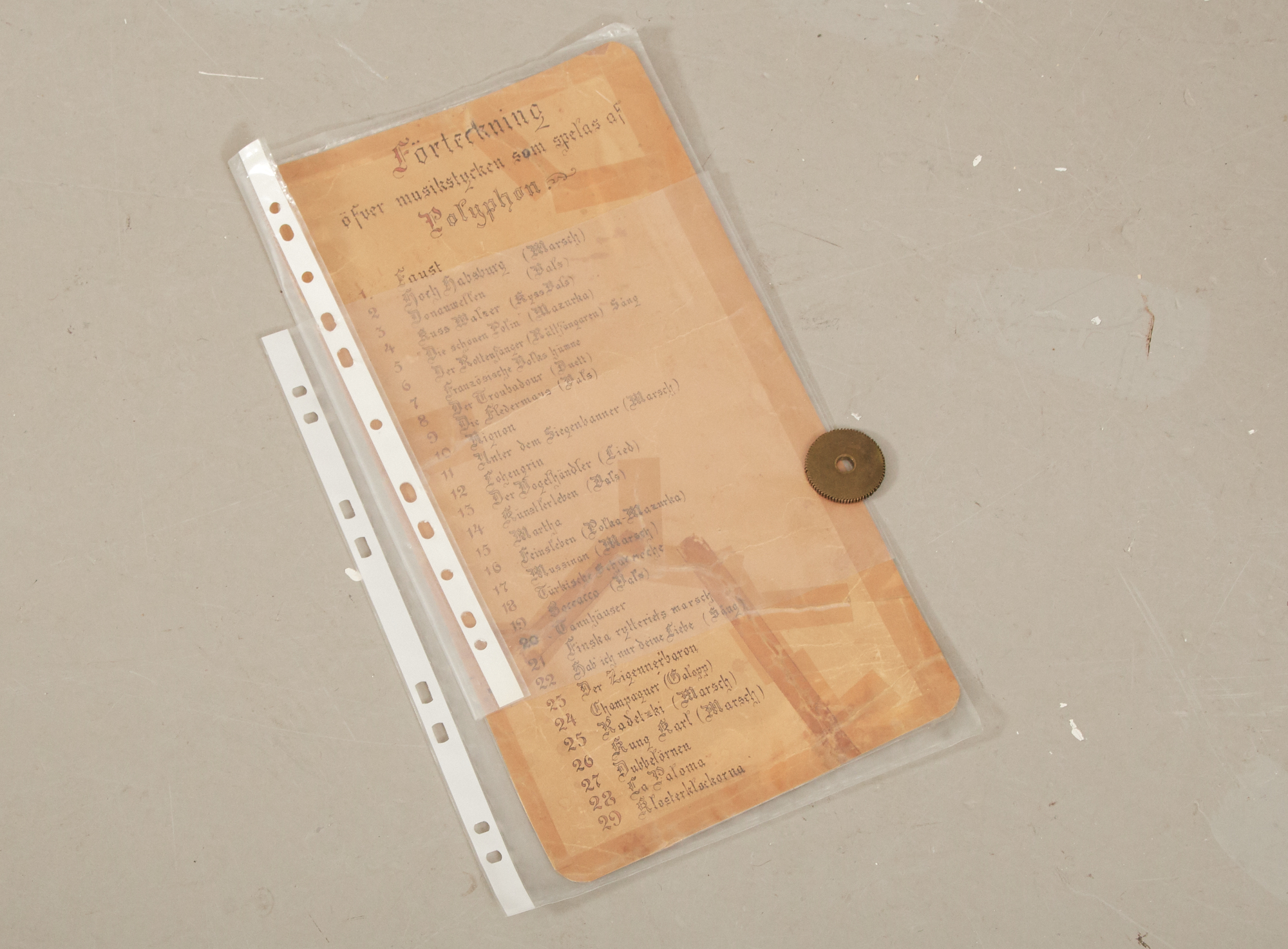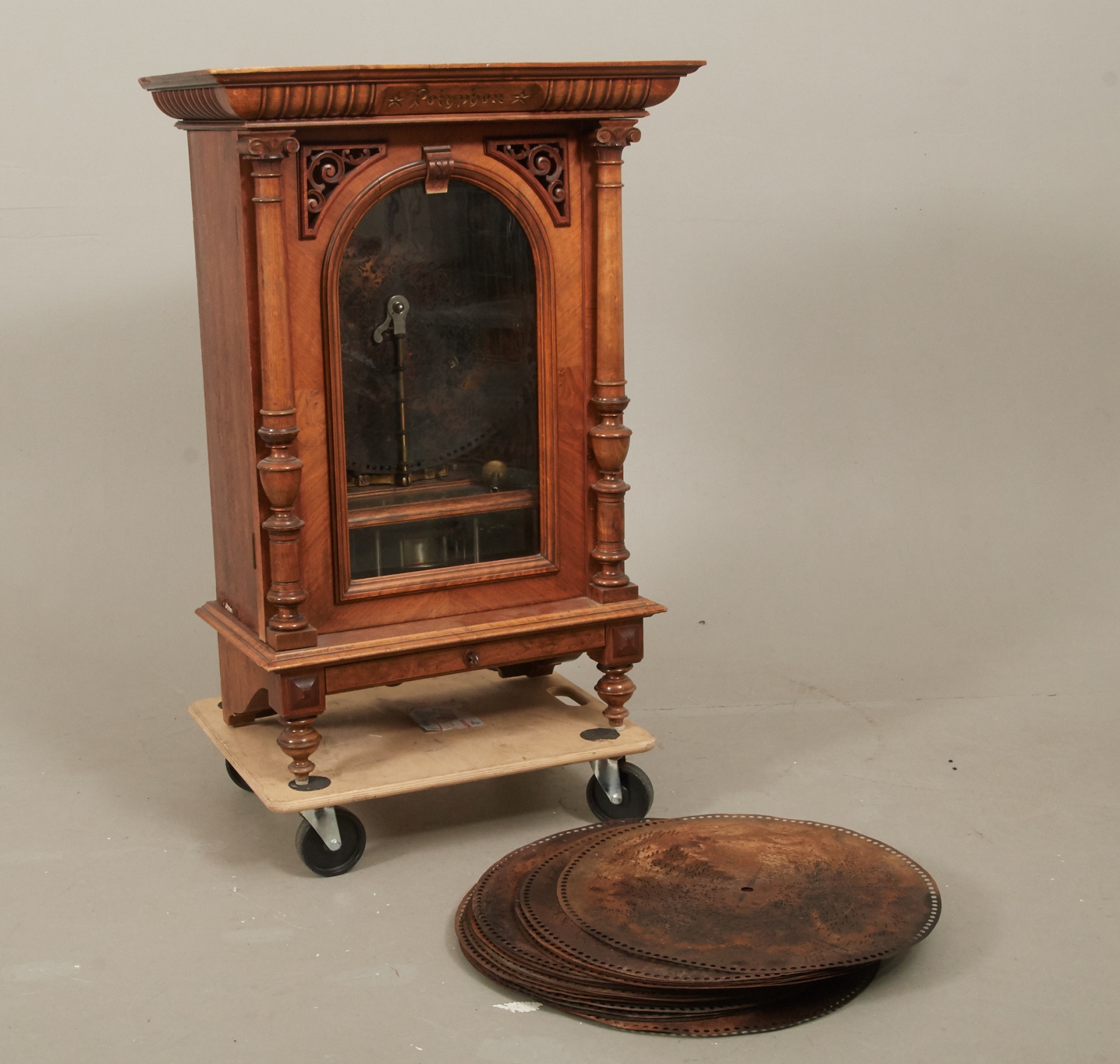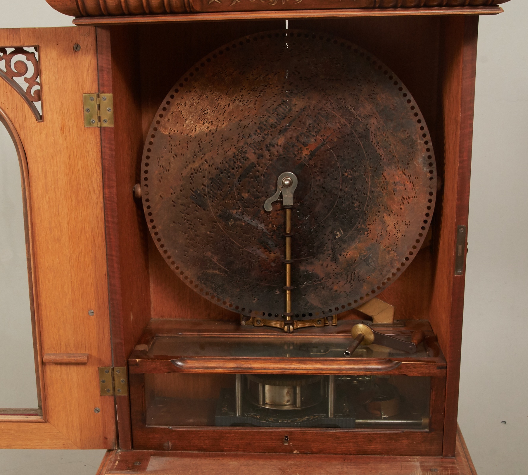 Nyrennässansstil, omkring 1900-talets början, 70 x 40 cm, höjd 98 cm, 26 skivor medföljer, vev, samt 5-öringar medföljer, saknar överstycke. Bruksslitage.