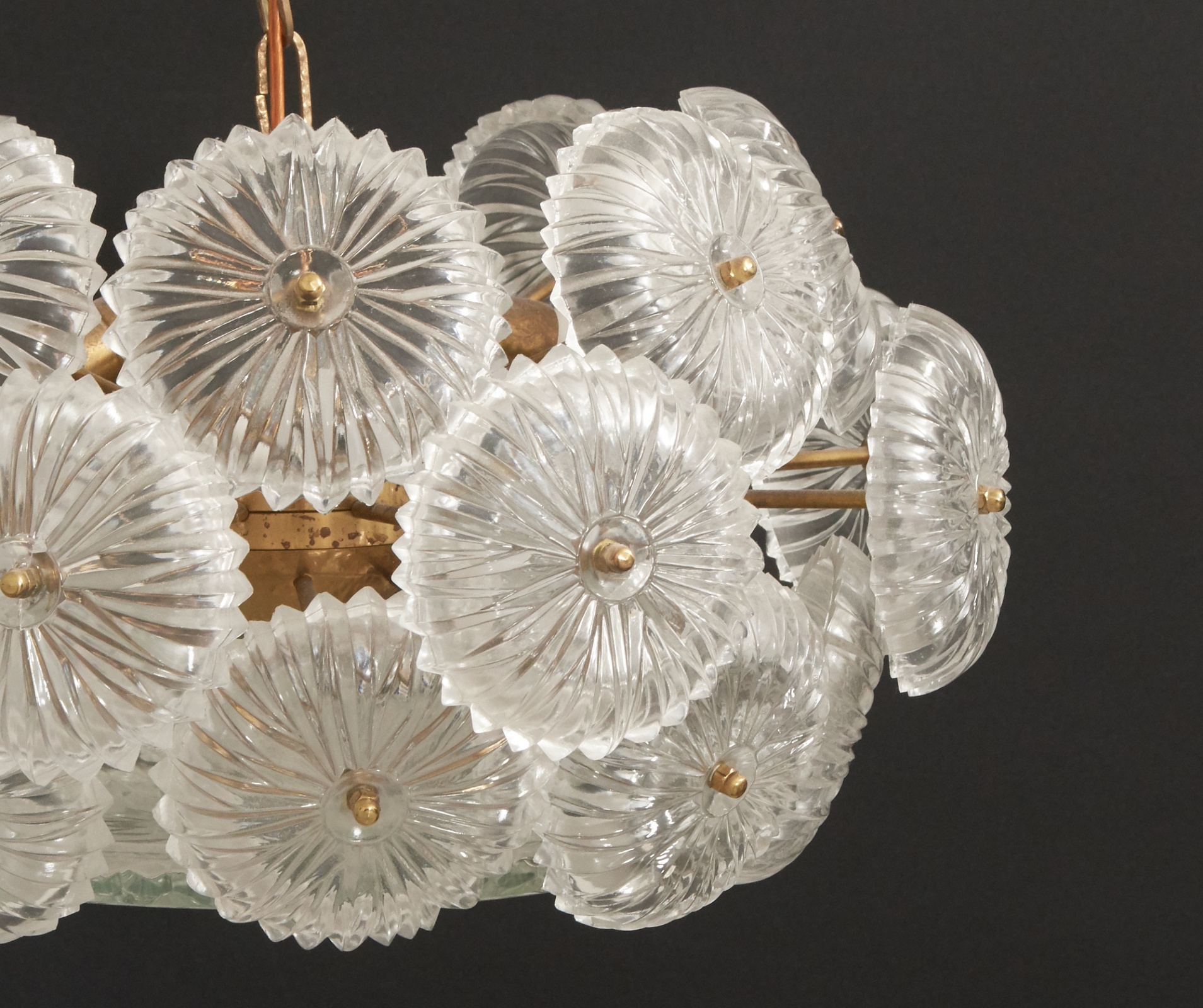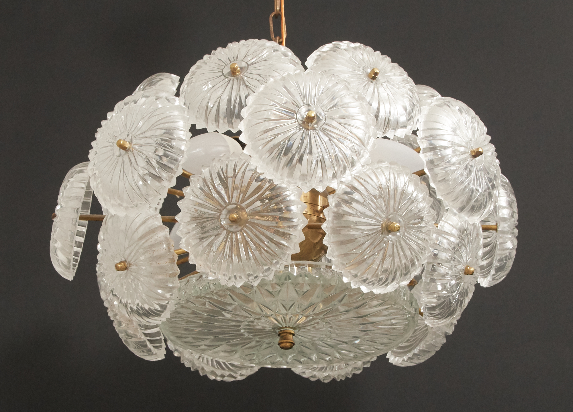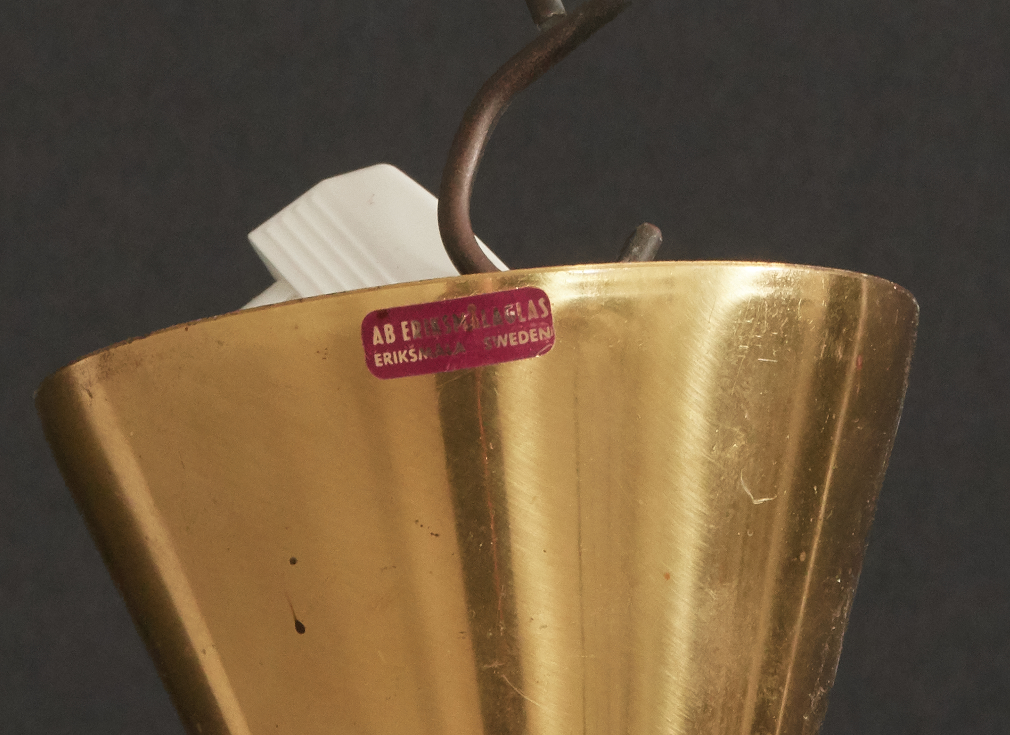 Mässing, samt glas, 4 elektriska ljuspunkter, diam 40 cm, höjd exkl upphängning ca 25 cm. En blomma saknas.