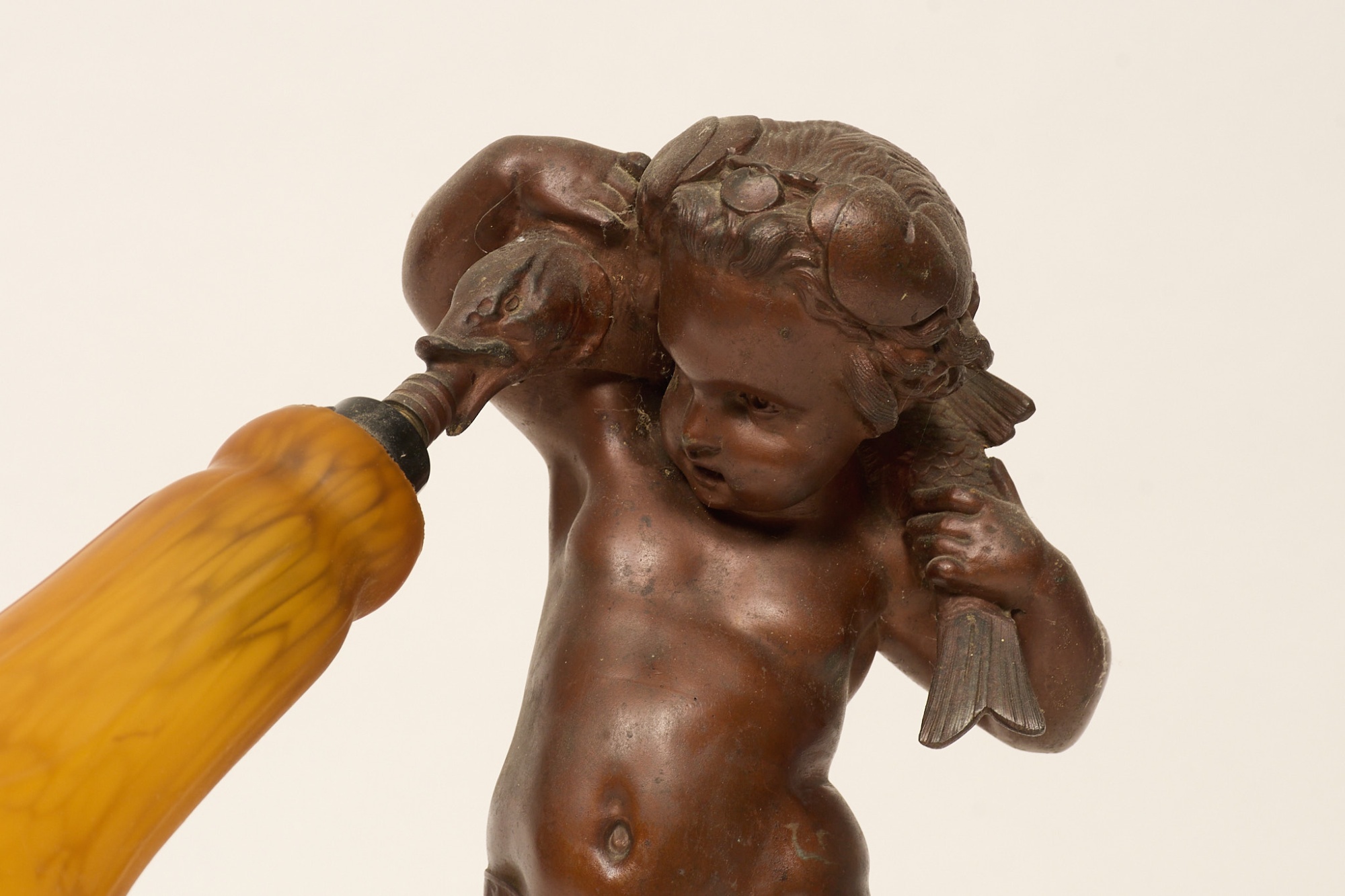 I form av Putti med fisk, höjd 38 cm, bruksslitage, lampfäste lagat/tejpat.