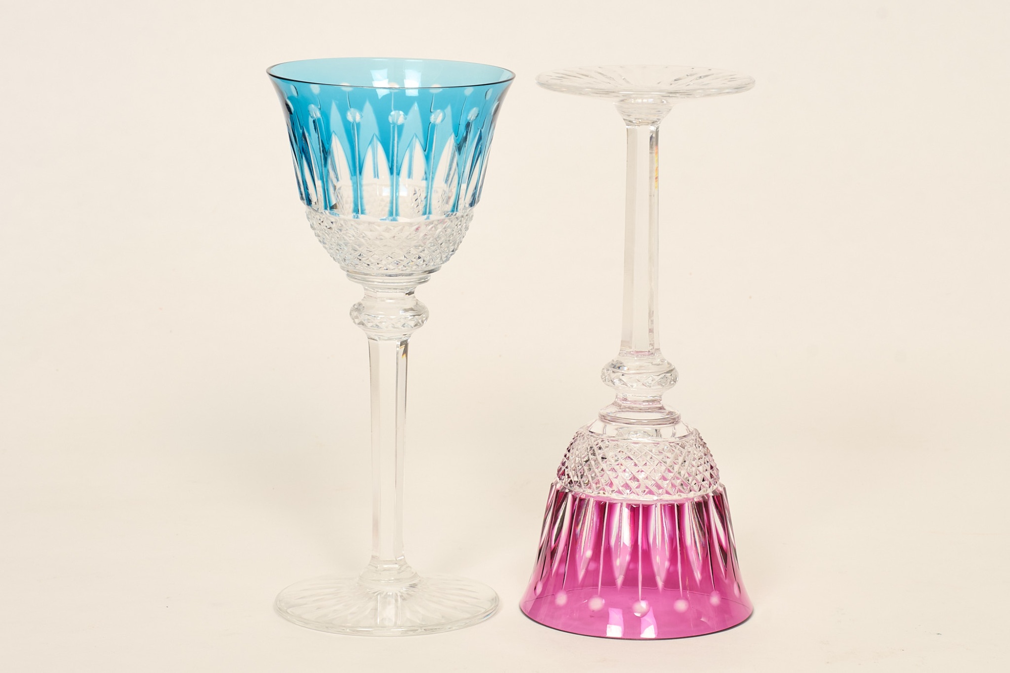 5 st, slipad kristall, olikfärgade, höjd 20 cm, 2 st märkta St Louis, smärre bruksslitage, men rött glas med minimal spricka/nagg i foten.