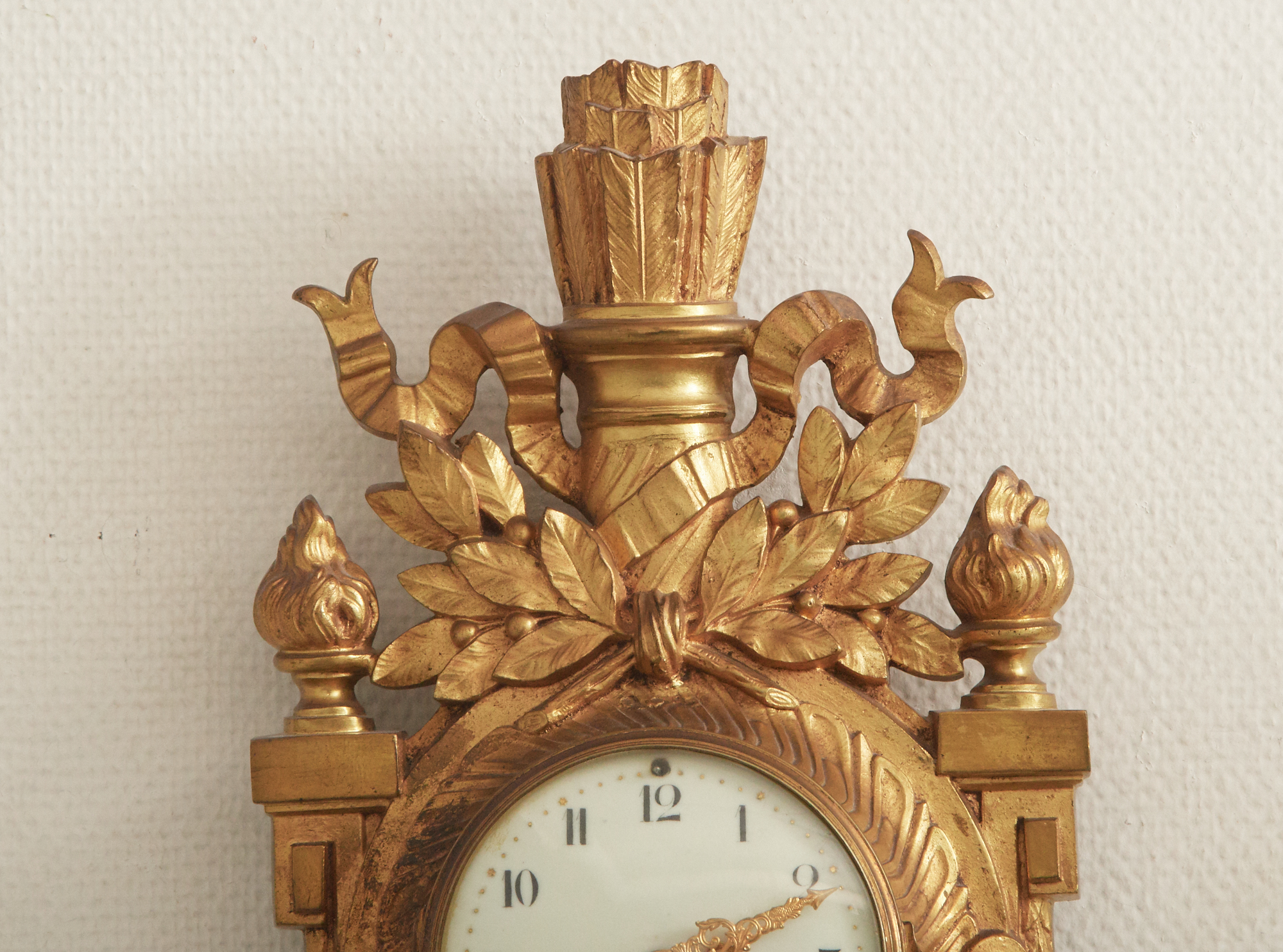 Bronserad, delvis förgylld mässing. Ca 52 x 26 cm. Smärre bruksslitage, pendel medföljer, nyckel saknas.