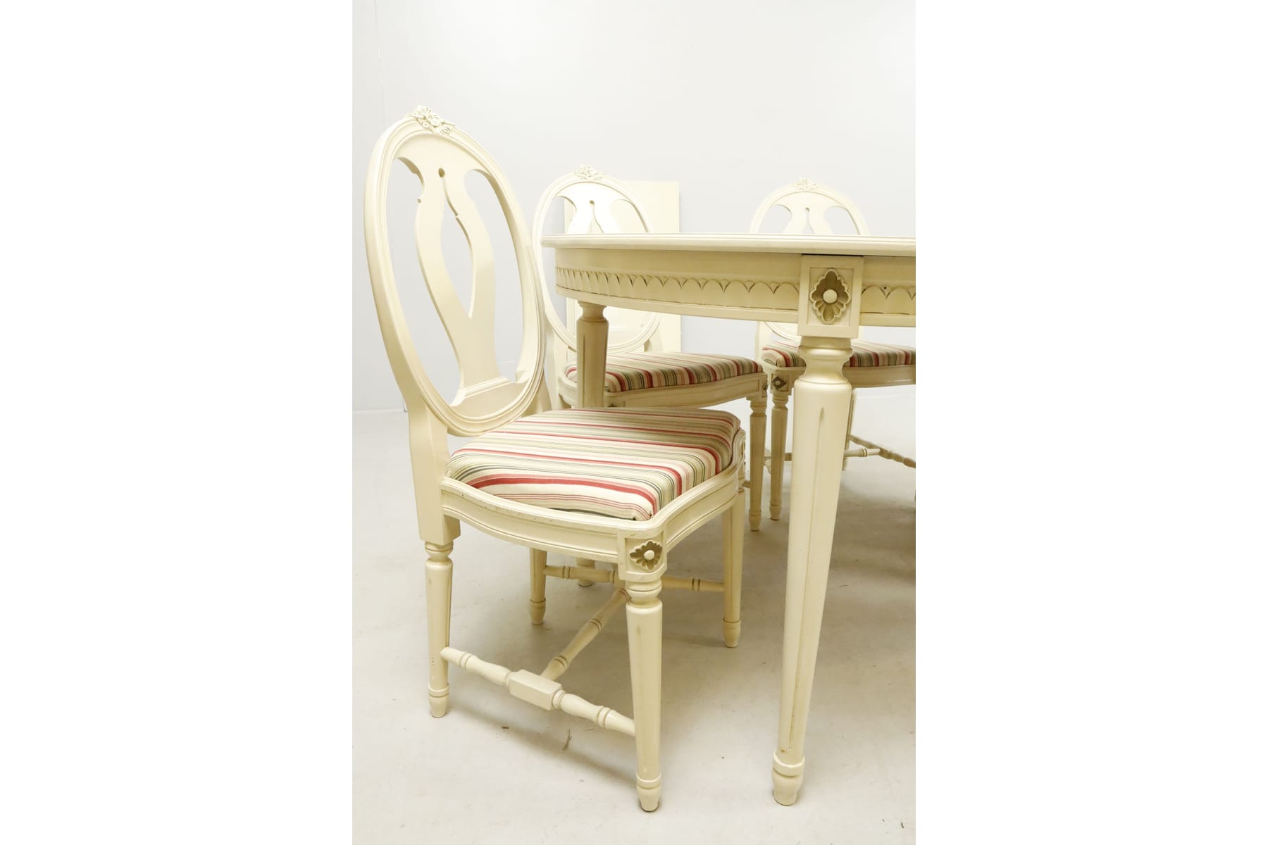 Matgrupp, bord med 4 stolar och 3 iläggsskivor, gustaviansk stil