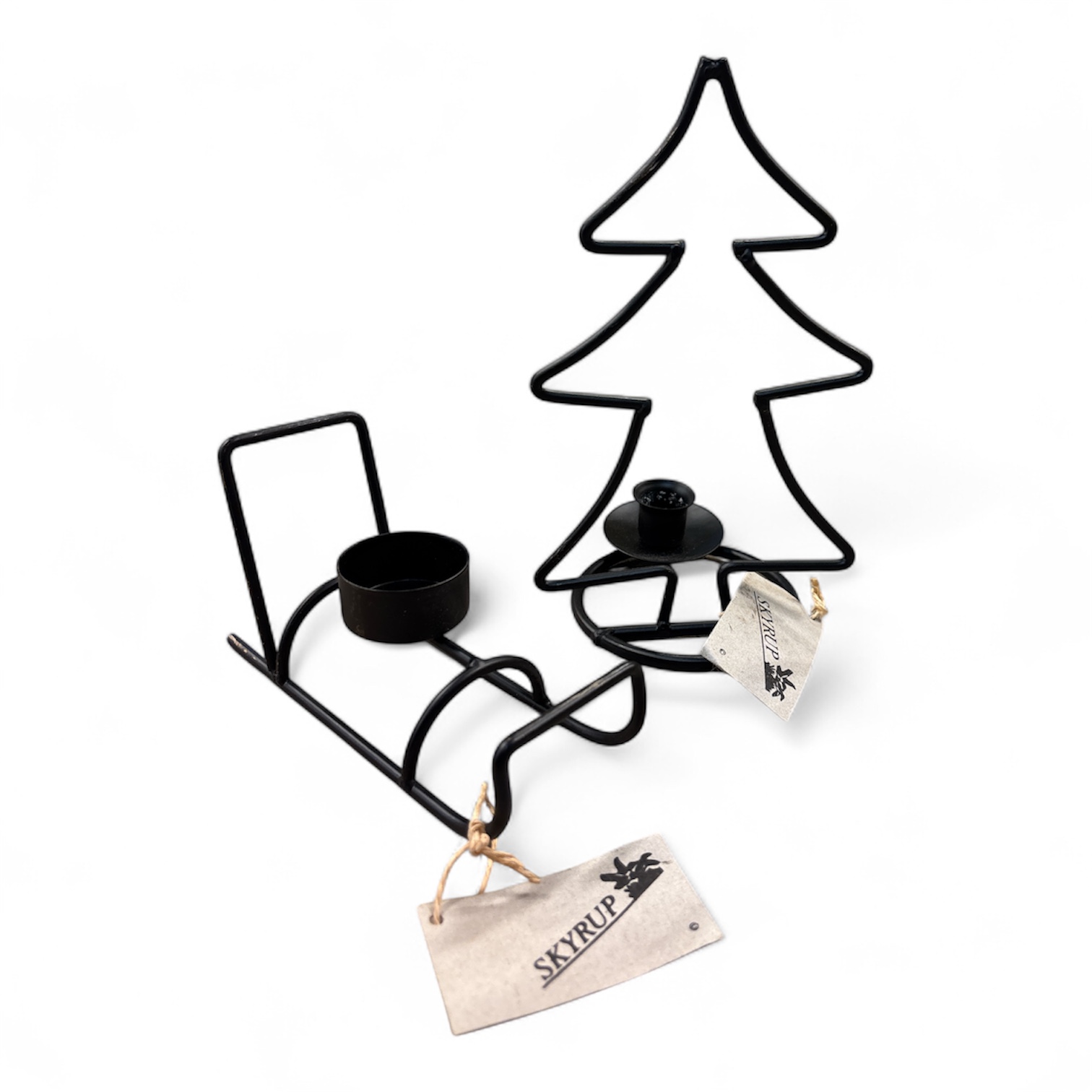 Två svarta ljusstakar från Skyrup Design – ena formad som gran, den andra som kälke.