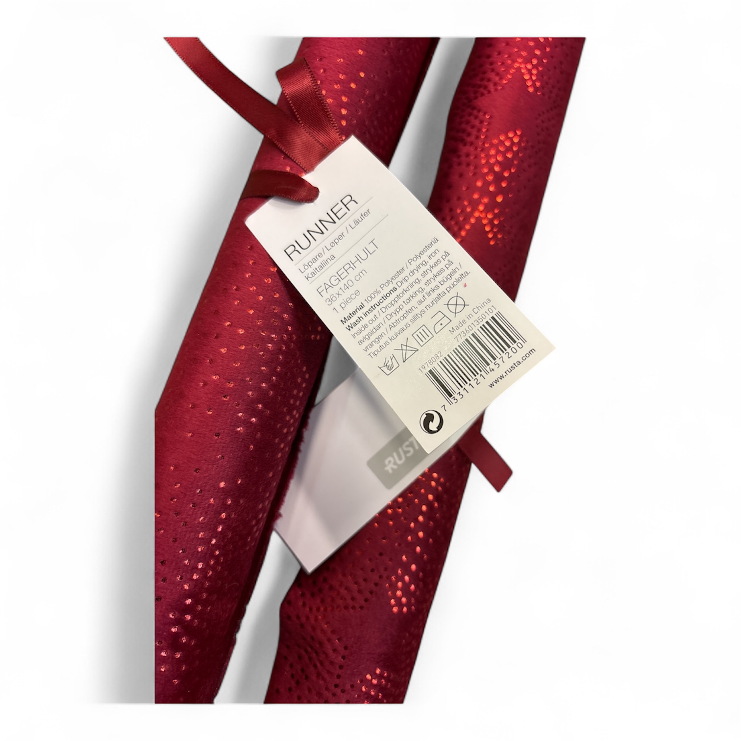 Två röda bordslöpare “Fagerhult” (30x140 cm) – nya med etikett.