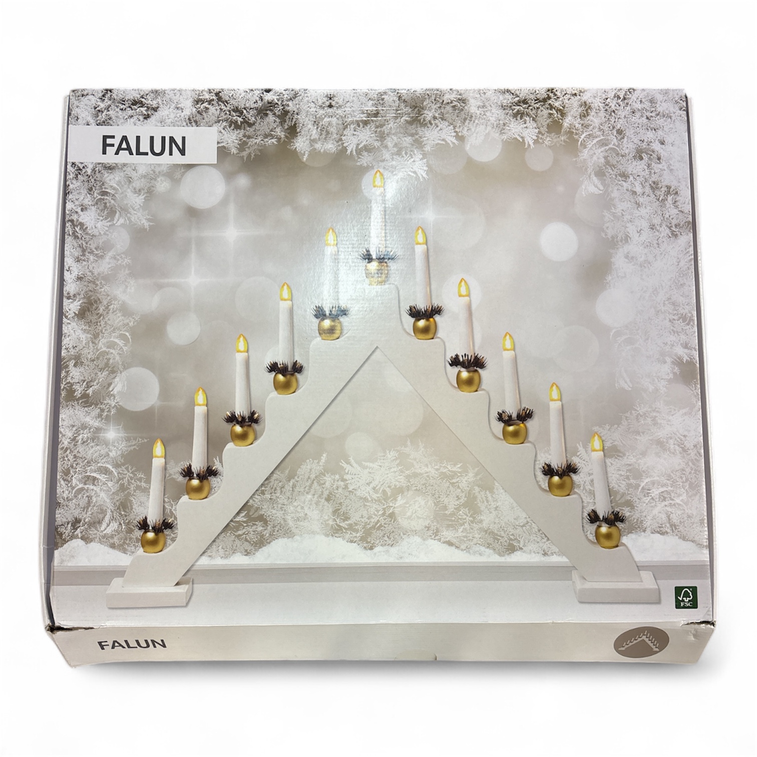 Innehåll:Adventsljusstake “Falun” – elegant vit träljusstake med 13 ljus och gulddetaljer, levereras i originalförpackning.