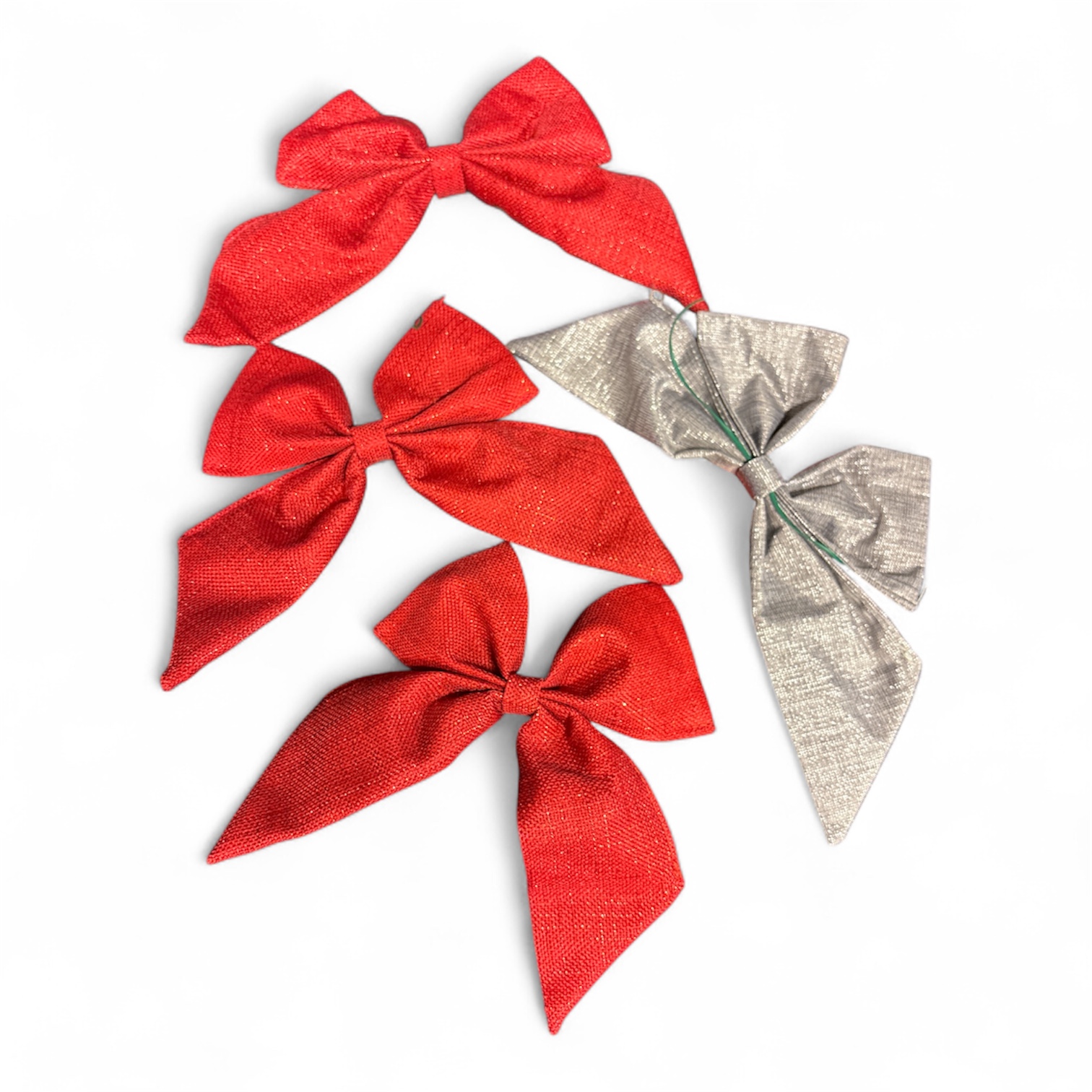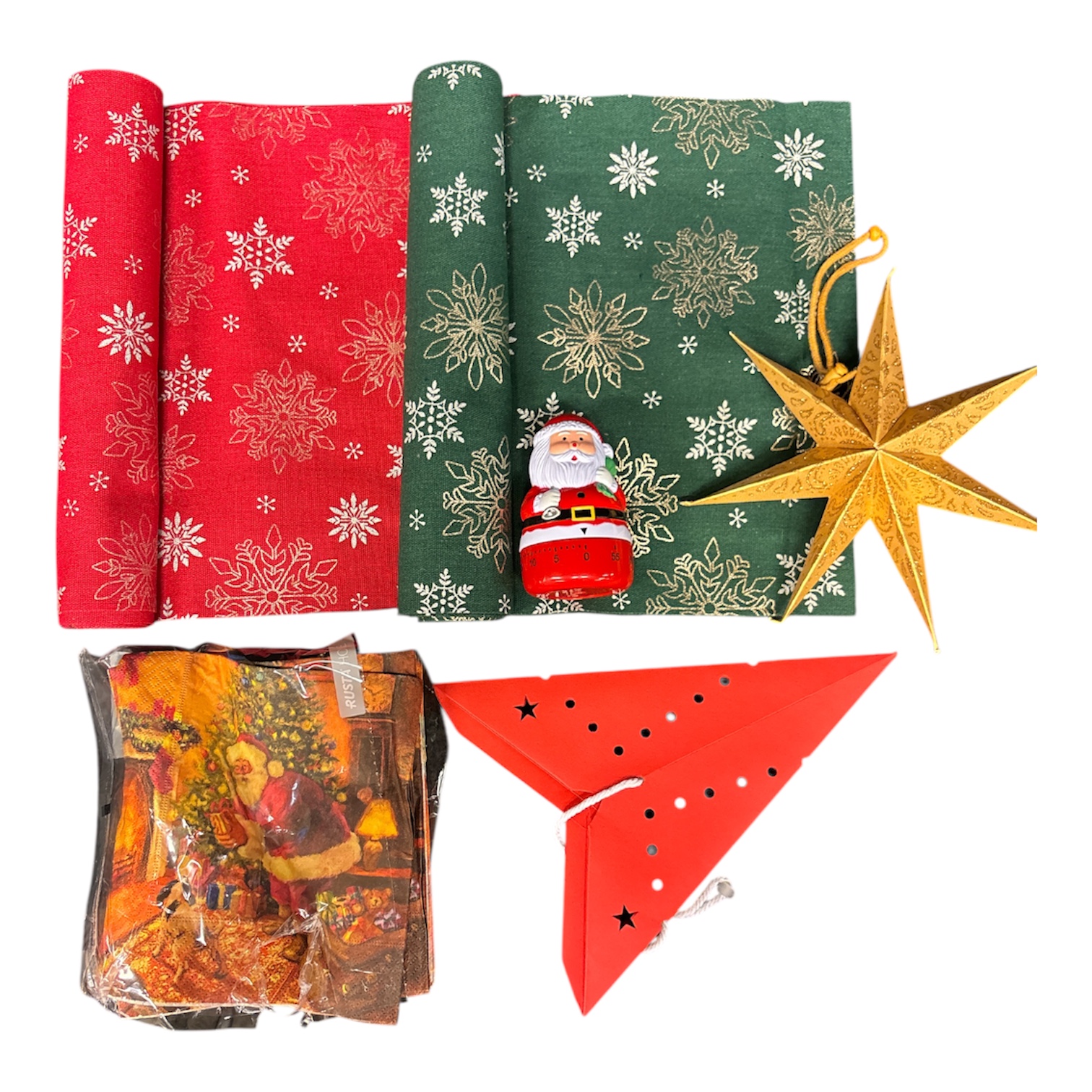 Fyra stora dekorrosetter – tre röda och en silverfärgad, perfekta till julgranen, dörrkransen eller paket.Gyllene julstjärna – hängande dekoration med struktur.Tomtefigur i klassisk stil.Två juldukar/löpare i rött och grönt med snöflingemotiv – nya och oanvända.Röd metallstjärna med ljushål – fin som fönsterdekoration eller bordsdetalj. Servetter med jultomtemotiv – bidrar till den klassiska julkänslan.