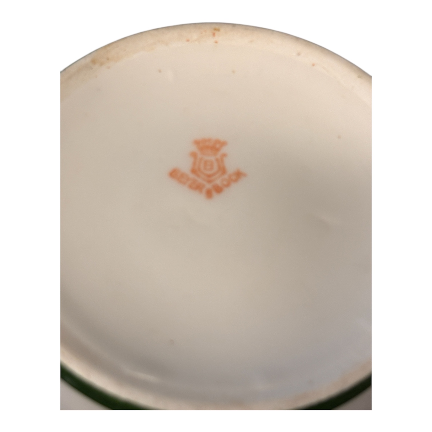 Vacker antik smörkupa i porslin från Beyer & Bock, Rudolstadt, Tyskland.Tillverkad omkring 1905–1920.Dekorerad med fiskmotiv runtom samt grön bård längs kanter och lock.Består av fat, burk och lock med handtag.