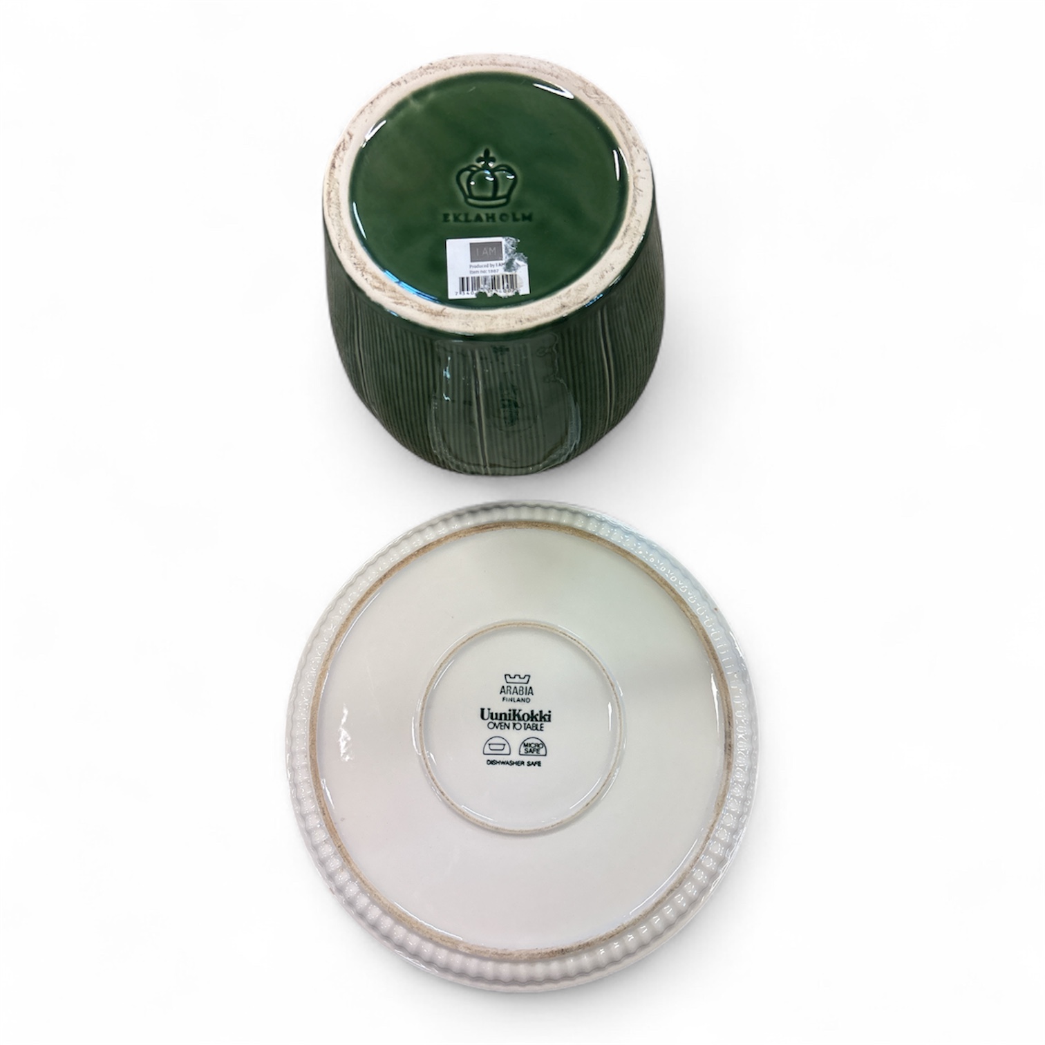 Elegant keramikset med en grön glaserad vas från Eklaholm och ett beige keramikfat från L’italia.Två stilrena föremål som kombinerar nordisk enkelhet med italiensk elegans.Vasen har en vacker grön glasyr med räfflad struktur, medan fatet är glaserat i varm beige ton med blank yta.