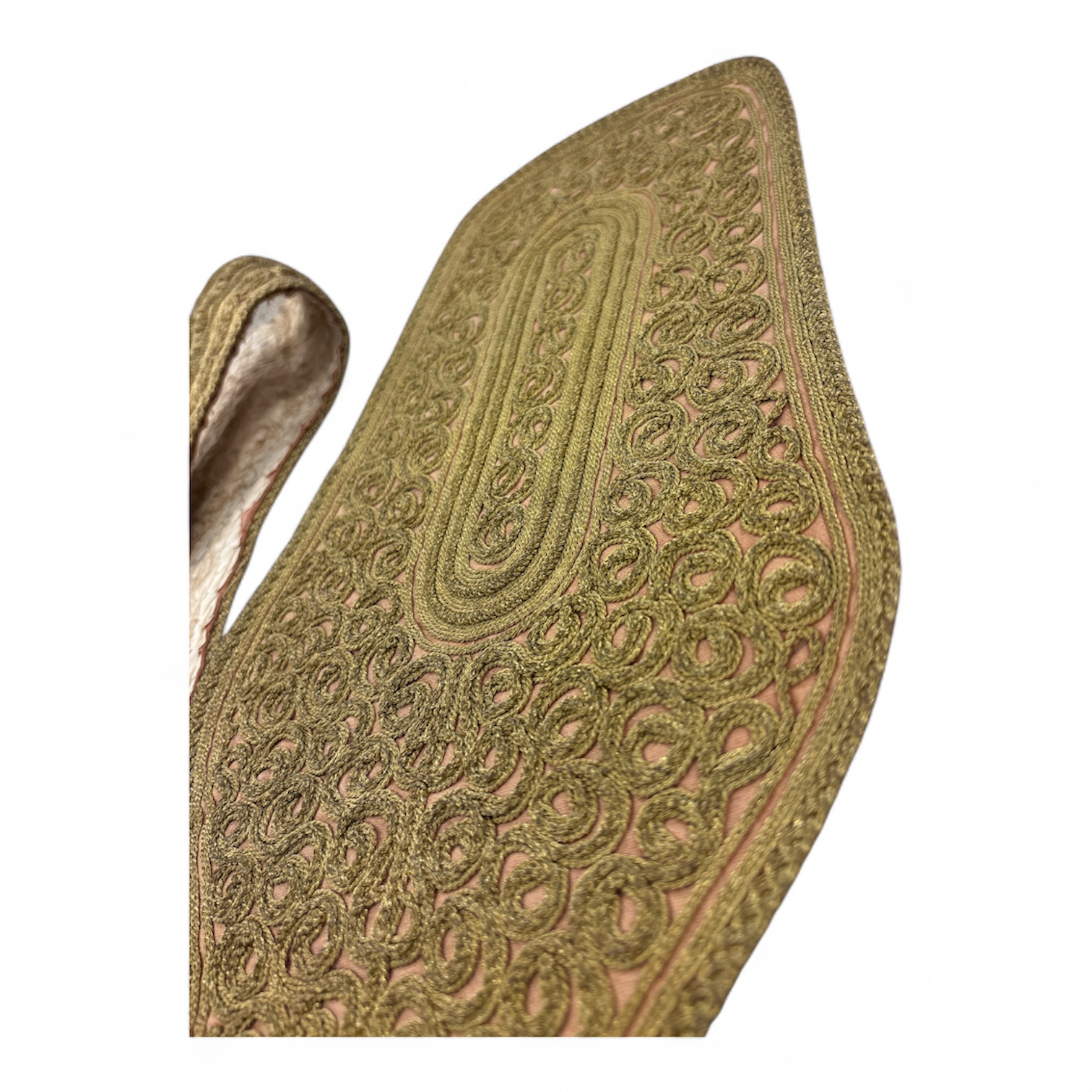 Vacker persisk textil i guldtråd, troligen en del av traditionell klädsel eller dekoration.Handbroderad med detaljerat mönster i metalltråd på tygbas – ett fantastiskt exempel på mellanösterns hantverkstradition.Kan användas som väggdekoration, samlarobjekt eller i textilkonst.
