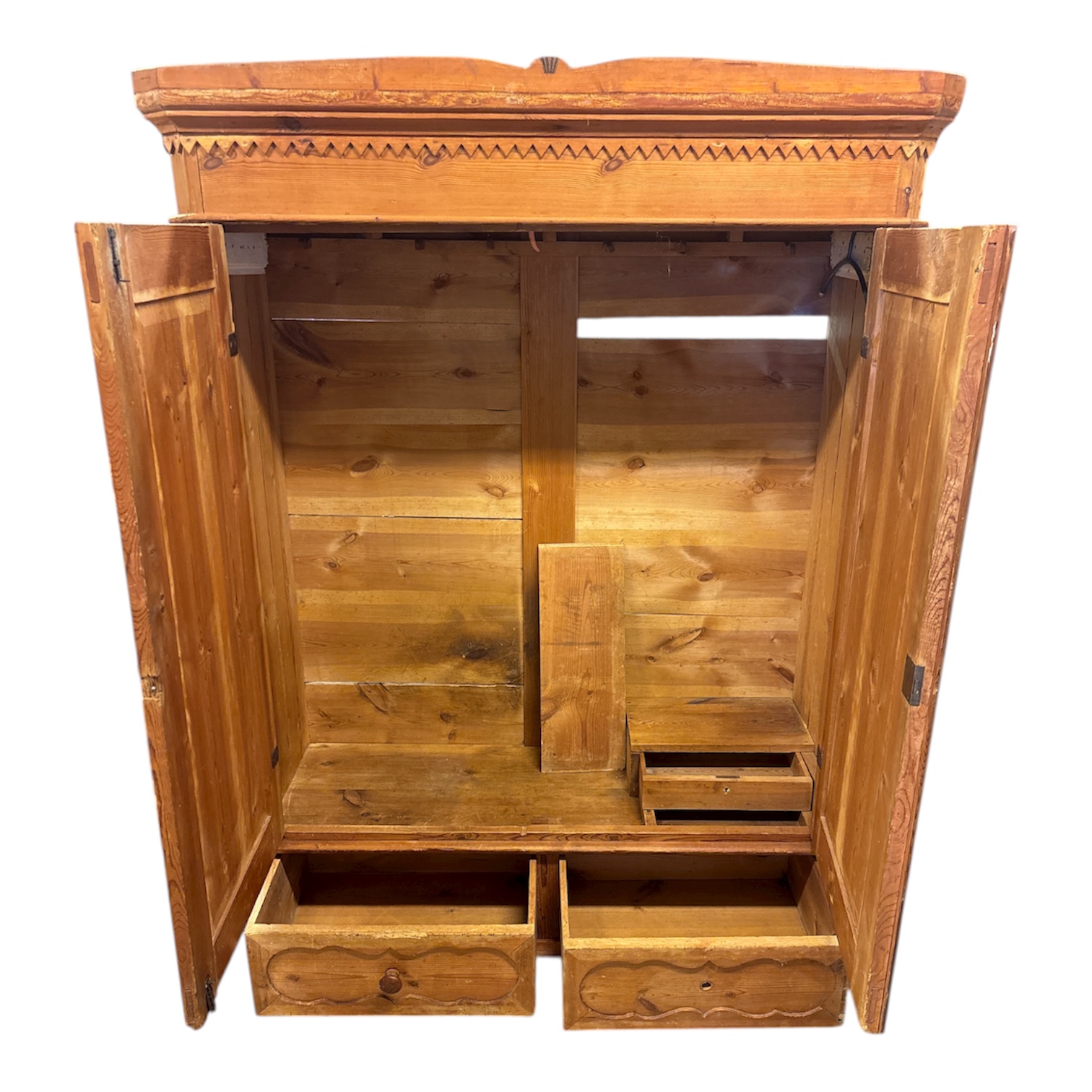 Vackert allmogeskåp i massivt furu, med två dörrar och två utdragslådor längst ner.Fint utförda profiler och snidade dekorationer på dörrar och krön.Ett äldre hantverk med charmig patina, troligen tillverkat i slutet av 1800-talet eller tidigt 1900-tal.