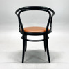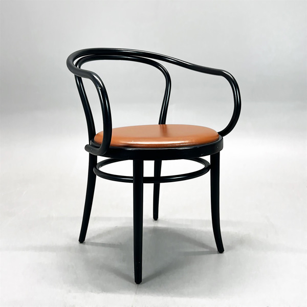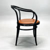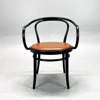 Karmstol från Ton, modell No 30. Formgiven av formgiven av Michael Thonet. Svartlackerad bok med sits i brunt skinn.