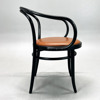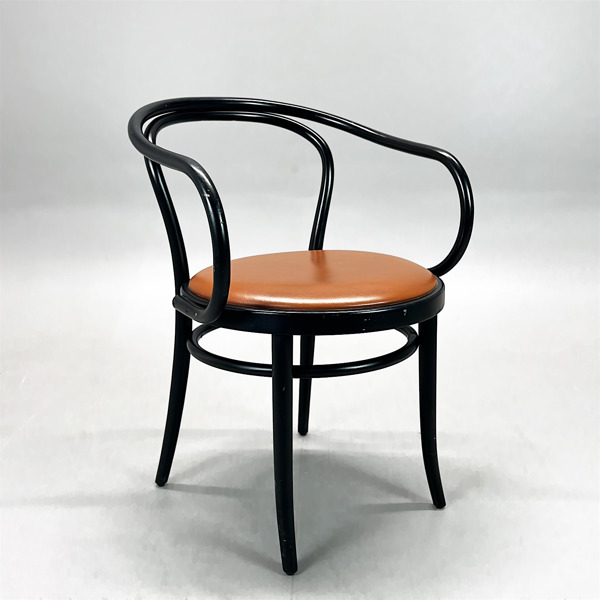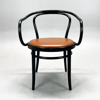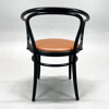 Karmstol från Ton, modell No 30. Formgiven av formgiven av Michael Thonet. Svartlackerad bok med sits i brunt skinn. Etikettmärkt.