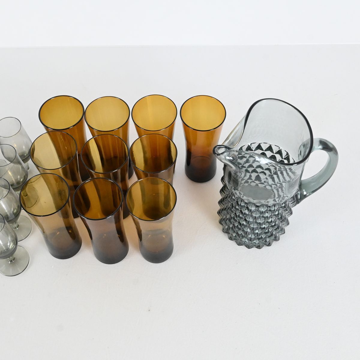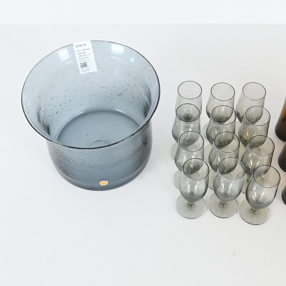 Parti, glasskål, kanna, glas, rökfärgat och bruntonat glas