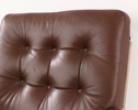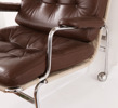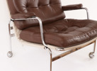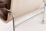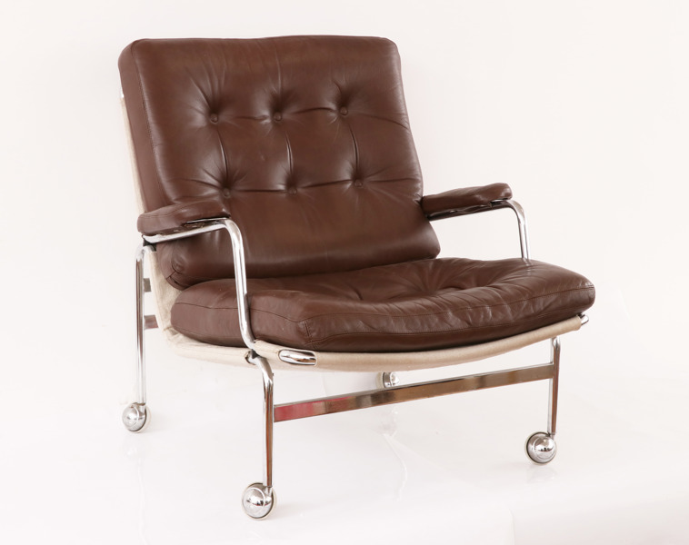 Kromad stål. Brun skinnklädsel med knappstoppning. Linnecanvas. På hjultrissor.