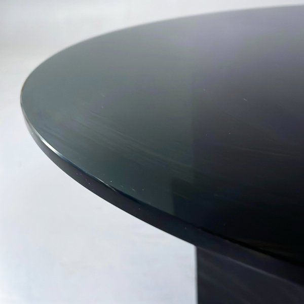 Soffbord från Wendelbo, modell Arc small. Cirkulär skivan i glas vilar på en grafiskt formad stålram med pulverlackerad yta.