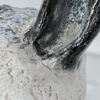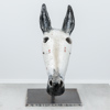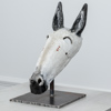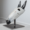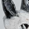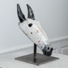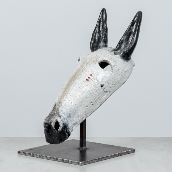 Skulptur i glaserad keramik på ställning i järn.