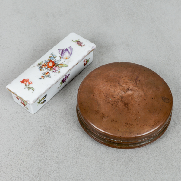 Dosa, koppar, med datering, 1800-talets första hälft samt porslinsask